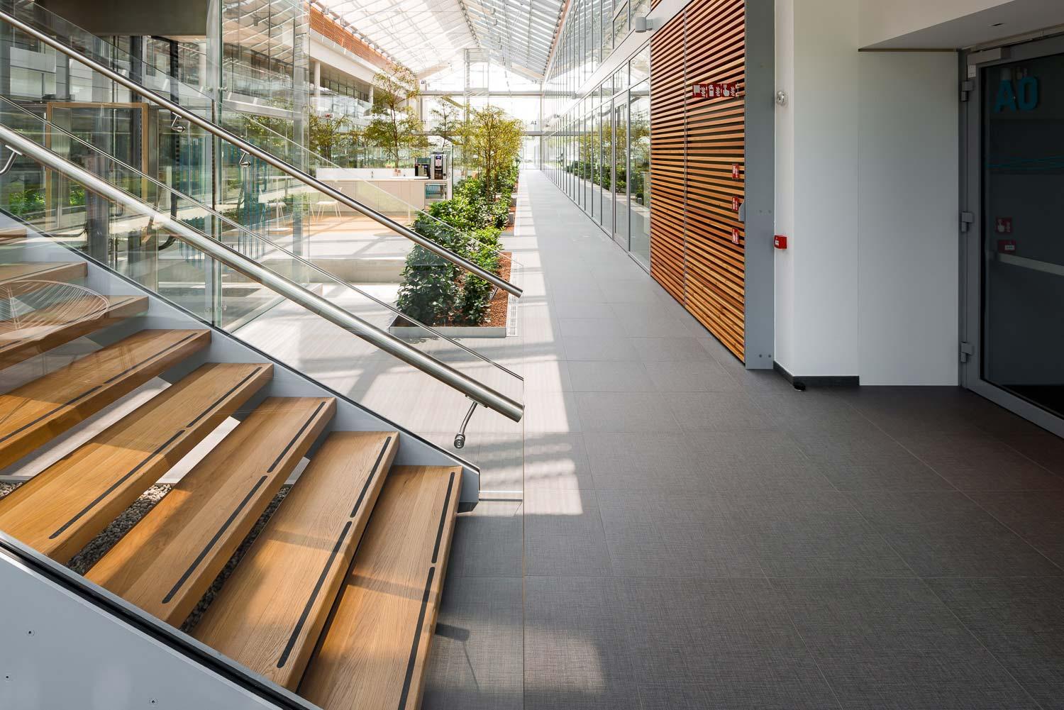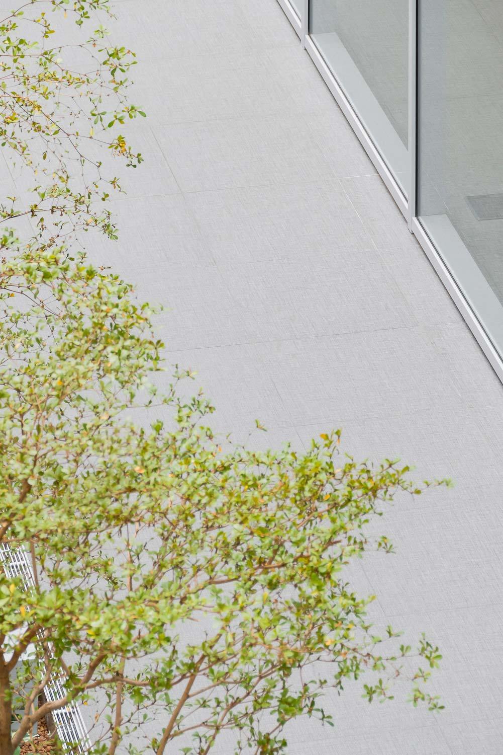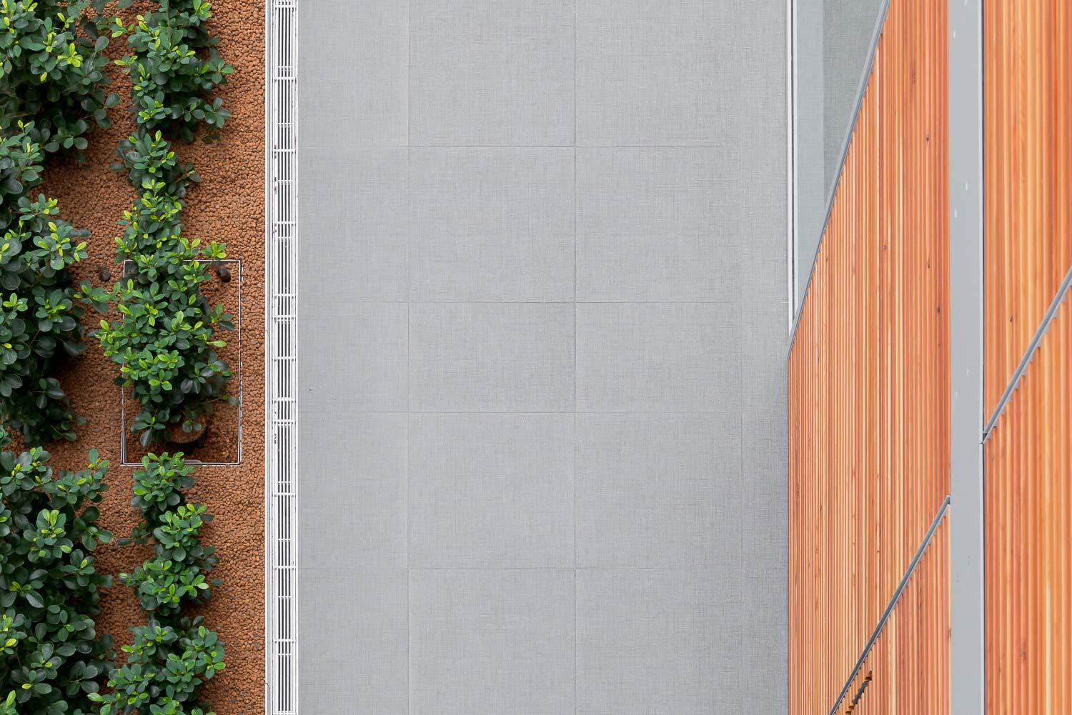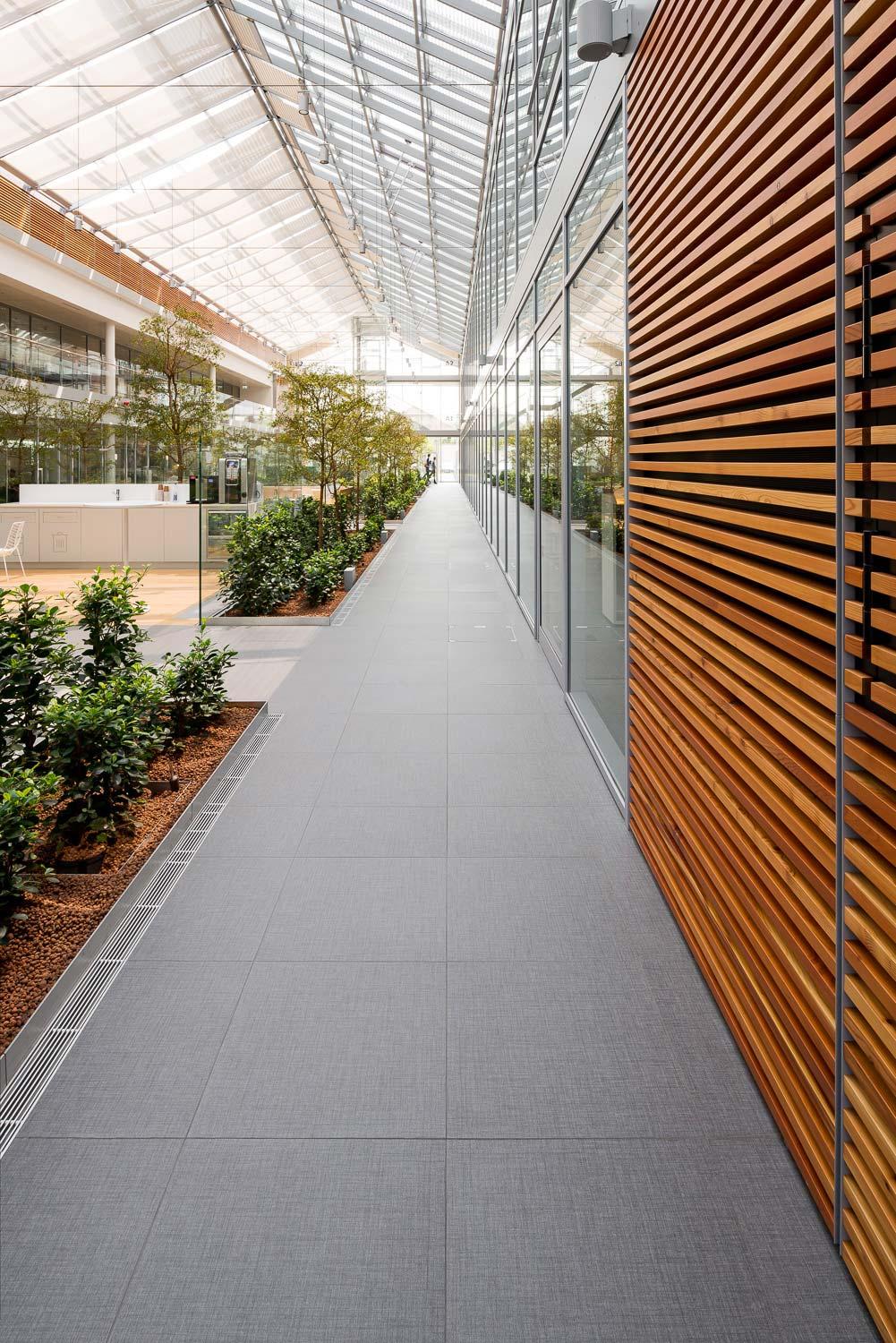 This design choice clearly defines pathways and areas intended for lingering, with the added benefit of the attractive effects created on the tiles’ surface patterning by the natural light entering through the large glazed areas in the roof.