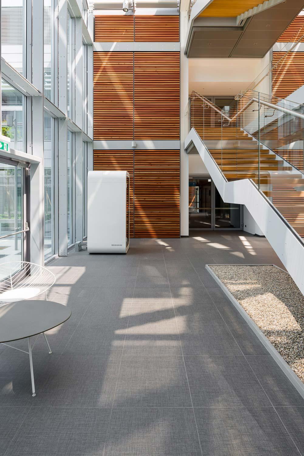 Inside the glazed conservatory areas, the rectified stoneware tiles from a Marazzi “custom” fabric-effect collection, with an unusual, softly “woven” pattern, provide a patterned frame in a very fashionable anthracite grey for the planted areas or the zones with parquet flooring.
