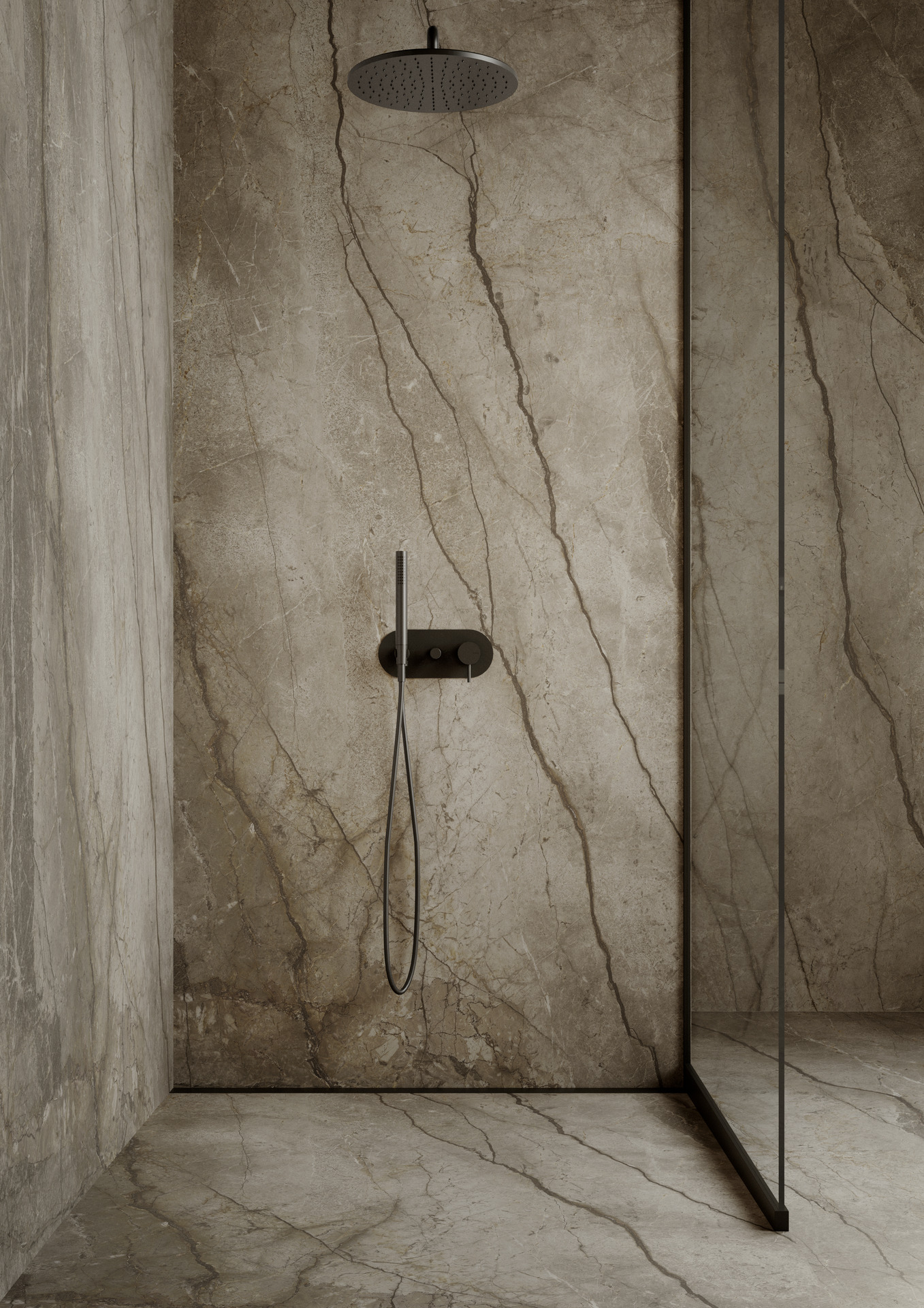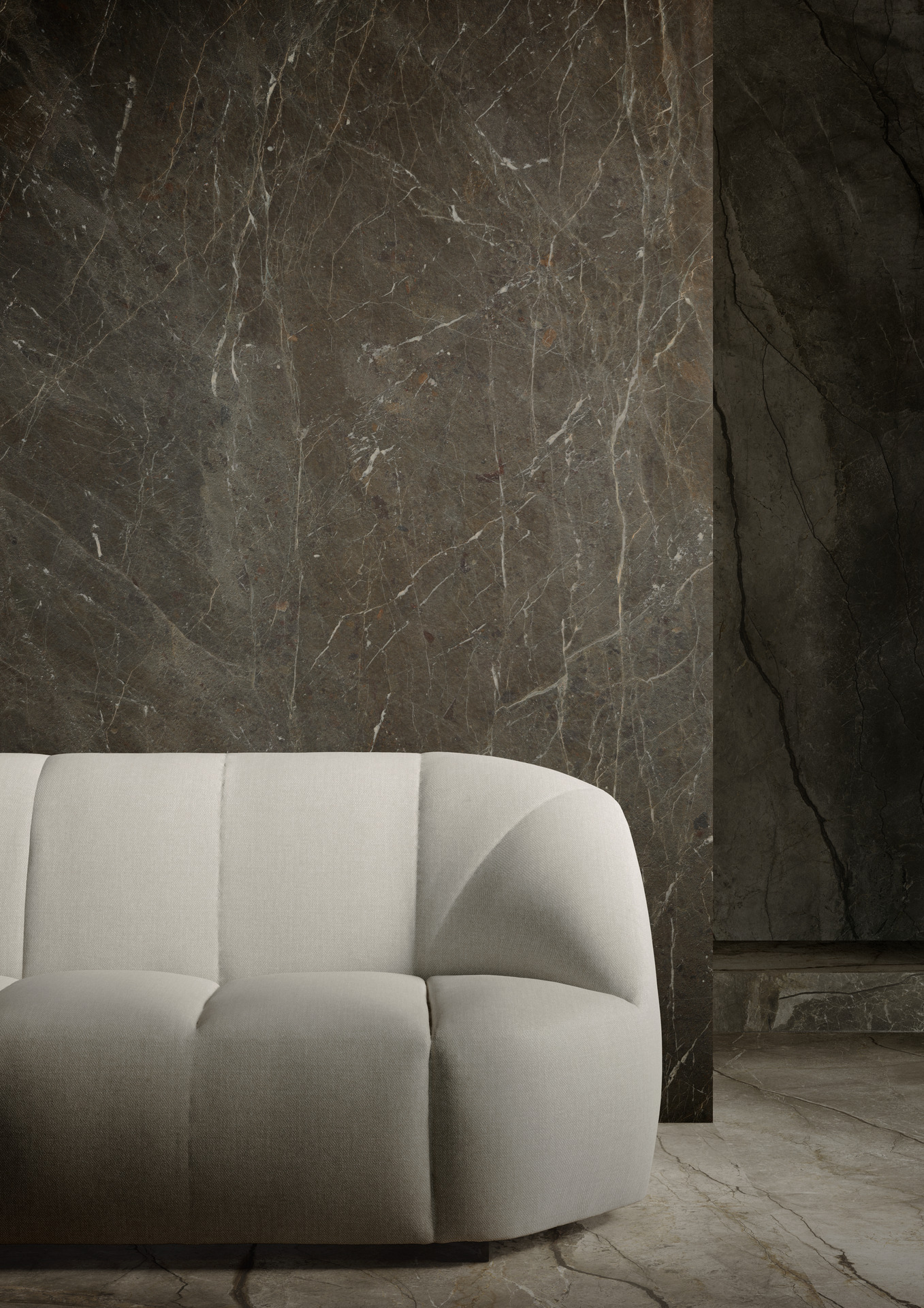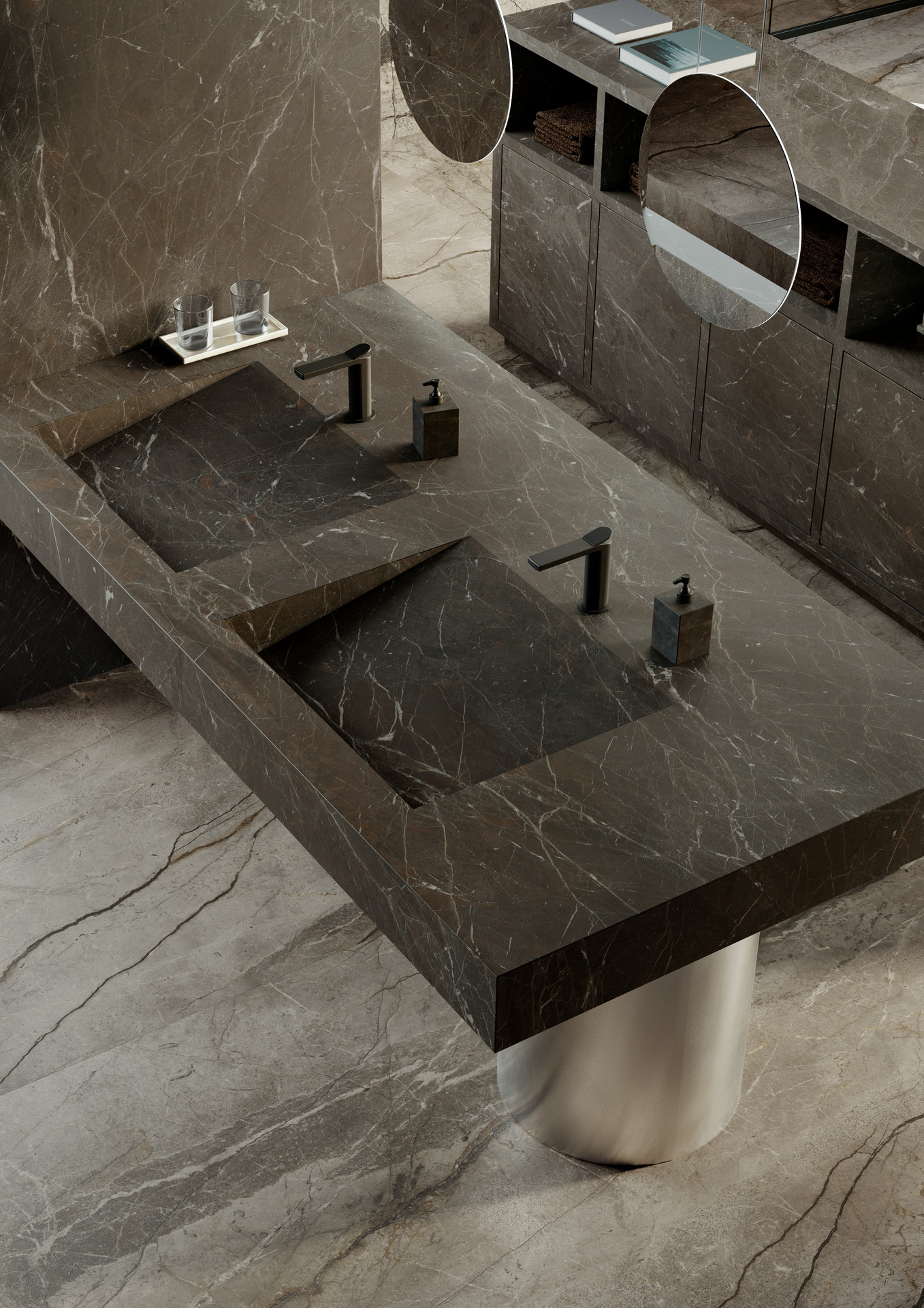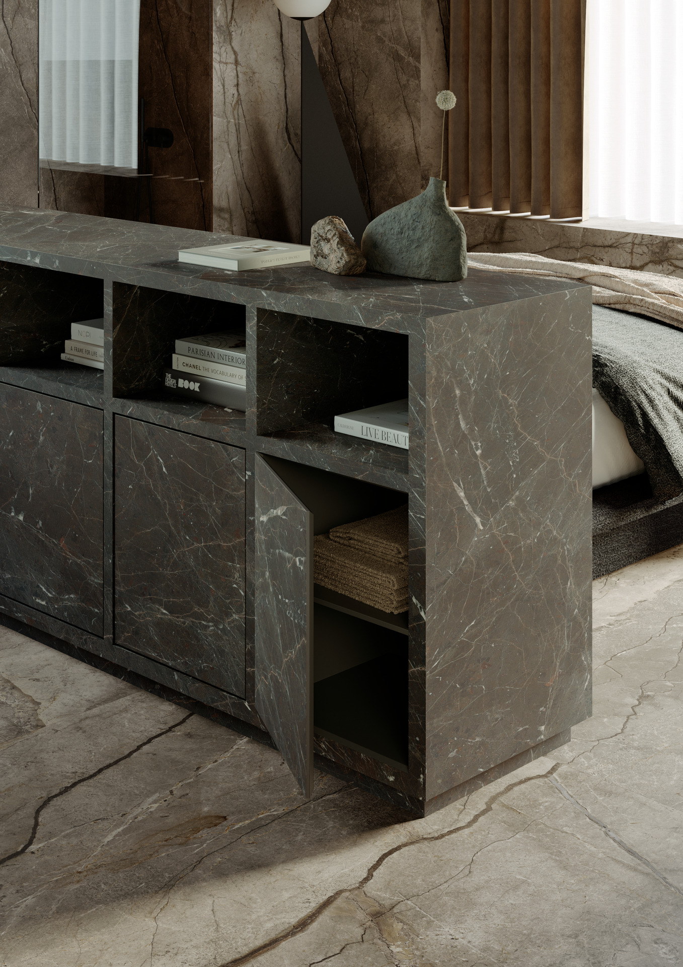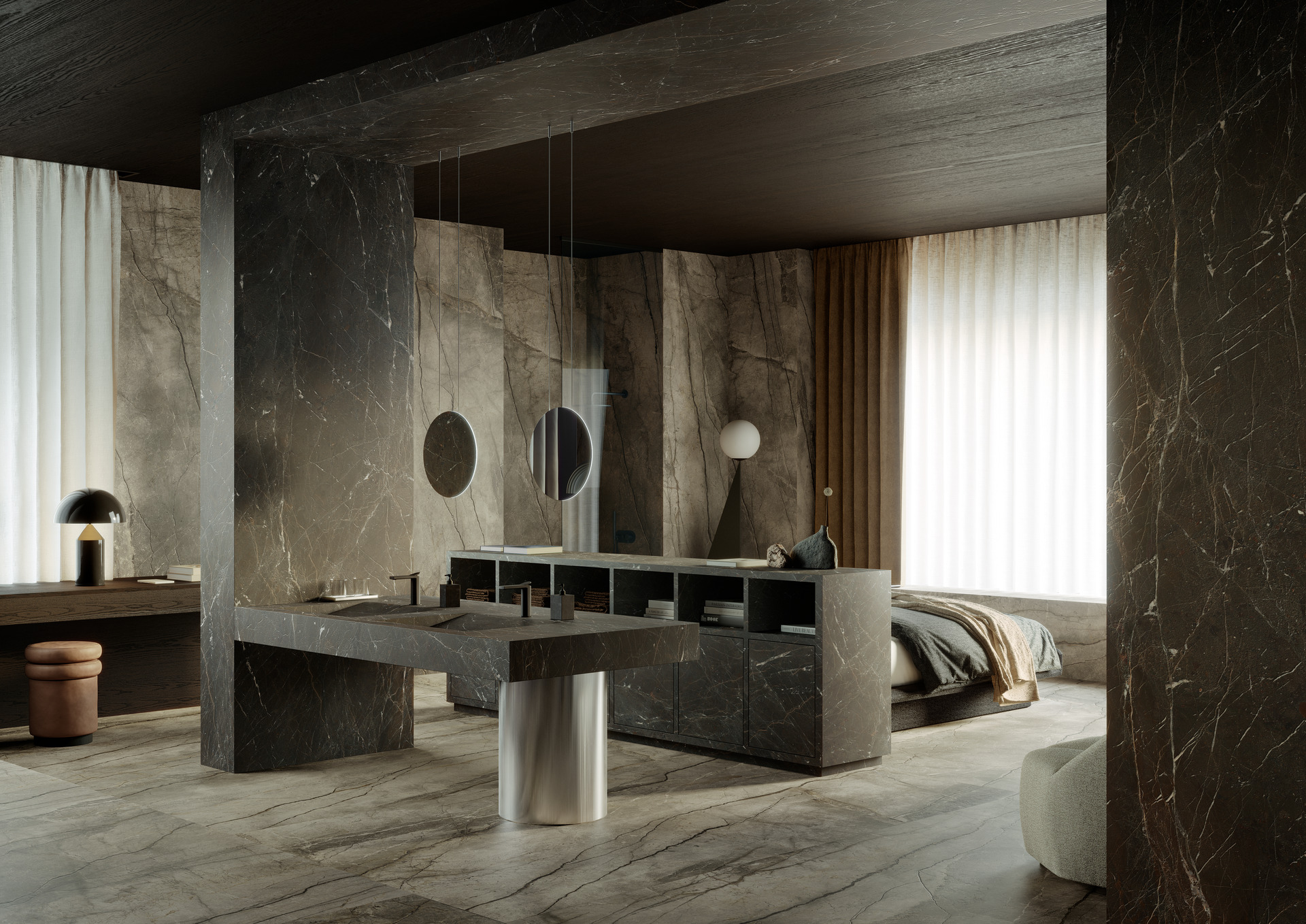 The project reveals the large-size slabs’ versatility of expression: the interior rejects the sequential room layout found in conventional suites in favour of an open-plan arrangement with functional areas – living and sleeping zones and bathroom – which merge in a seamless flow. This progression of areas is orchestrated by the materials themselves: Silver Root is widely used on the perimeter walls and on the floor, while Breccia Imperiale appears in the bathroom and on its cabinet, which is also the bedhead, creating a kind of three-dimensional panel that defines the zone within the open-plan layout. Porcelain stoneware in the darkest shade denotes the bathroom’s most intimate functional area. For this specific use, The Top Breccia Imperiale slabs are treated with the Puro Marazzi Antibacterial Premium Technology, able to eliminate up to 99.9% of bacteria and other harmful microorganisms from surfaces.