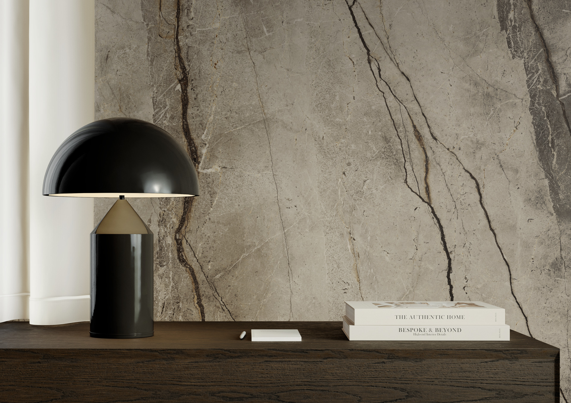 In the elegant, sophisticated, cosmopolitan hotel suite, The Top Stone Look large-size slab coverings are used widely and creatively: from the more traditional wall coverings to the tops of furniture or bathroom countertops and furnishings. The interior design scheme uses just a few surfaces to create a more unified look. Although attuned to the style of the contract sector, the warm shades of Stone Look Silver Root and Breccia Imperiale, evoke the welcoming, reassuring mood of a home interior. This impression is reinforced by the extraordinary quality of the surfaces, given a striking tactile allure by the 3D Ink Premium Technology, with its unique matching of material, colour and 3D texture.