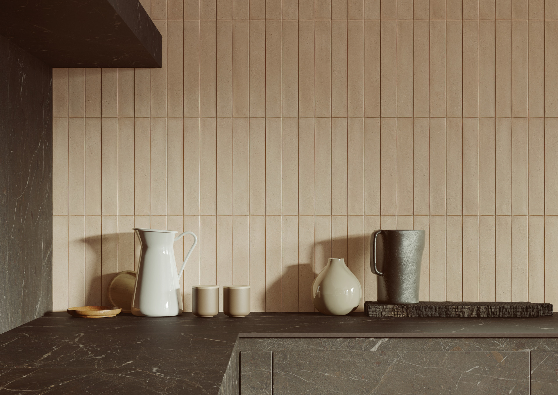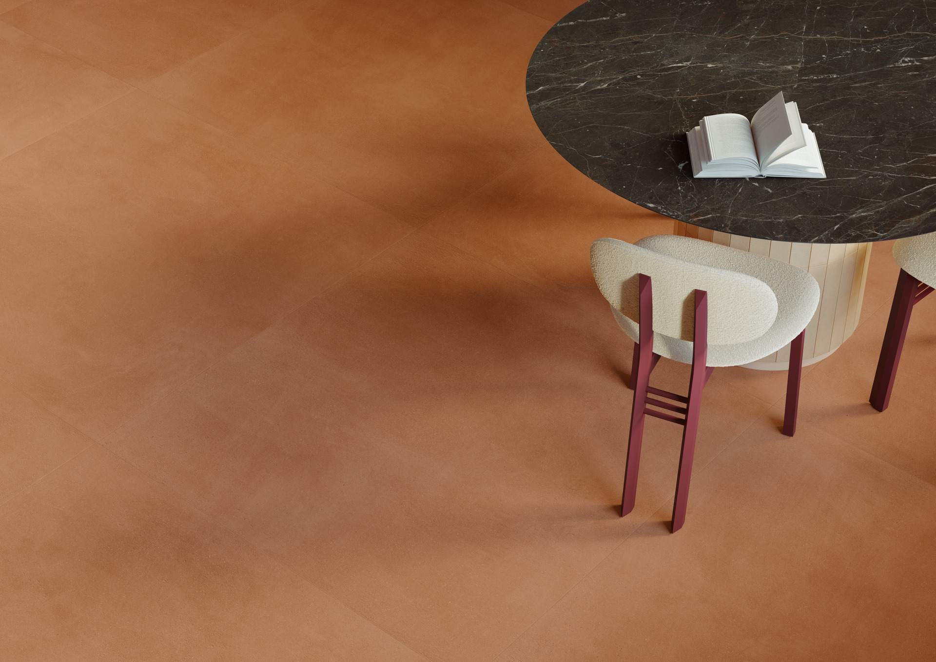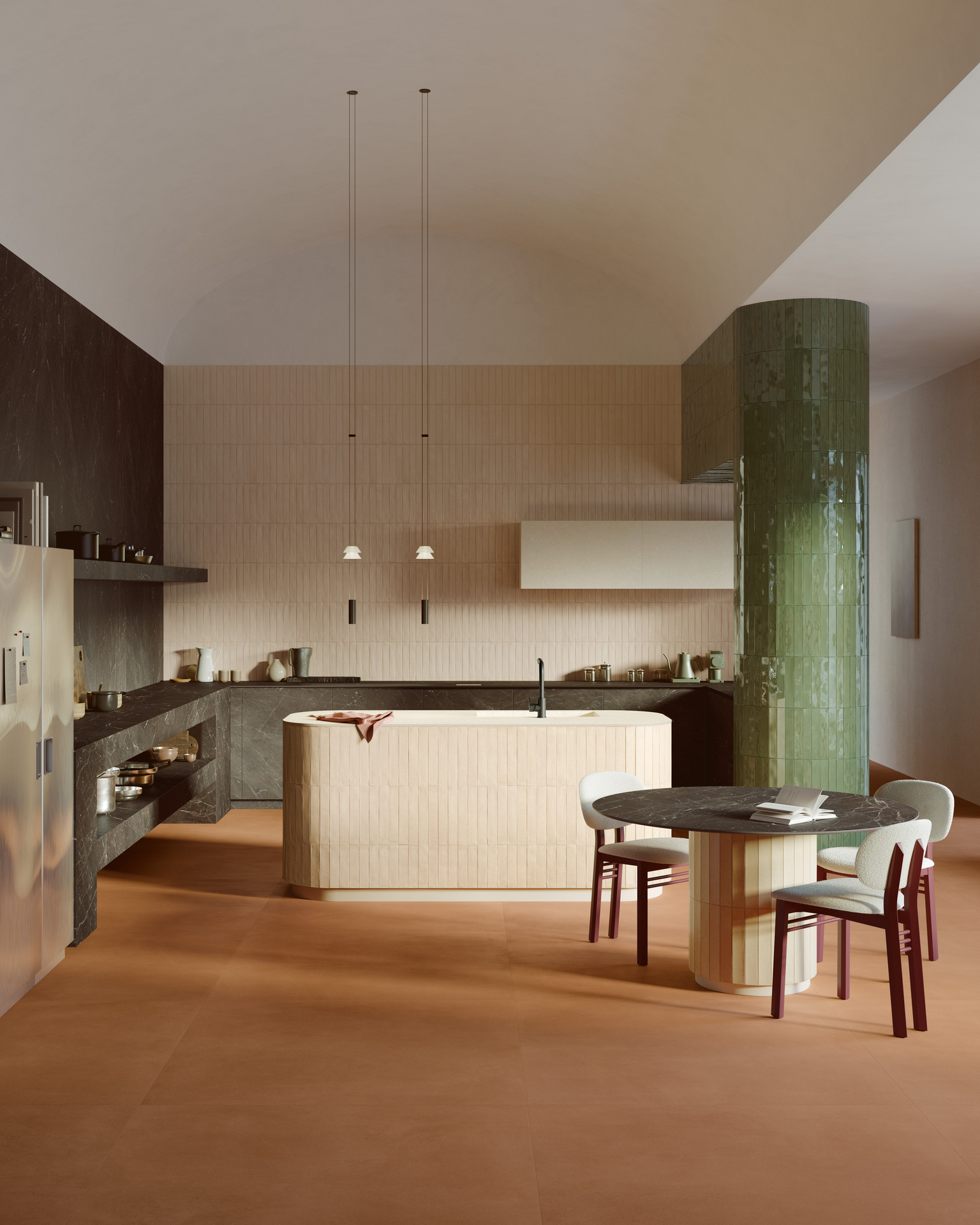 In contrast, the image of the kitchen used in the campaign offers a slice of daily life: a realistic interior of a home that has undergone renovation, reflecting its history and transformations, all shaped by the lives of its users.The chosen flooring is the Slow series inspired by traditional terracotta, with a warm, soft aesthetic achieved with the tactile effects of the 3D Ink technology. Breccia Imperiale reappears, this time used on the wall, for covering the storage units and for the top of the table. This single porcelain stoneware evokes traditional materials in the same way as the terracotta effect but is used in different roles, supported by the Puro Marazzi Antibacterial technology, which makes surfaces safe and suitable for contact with food.