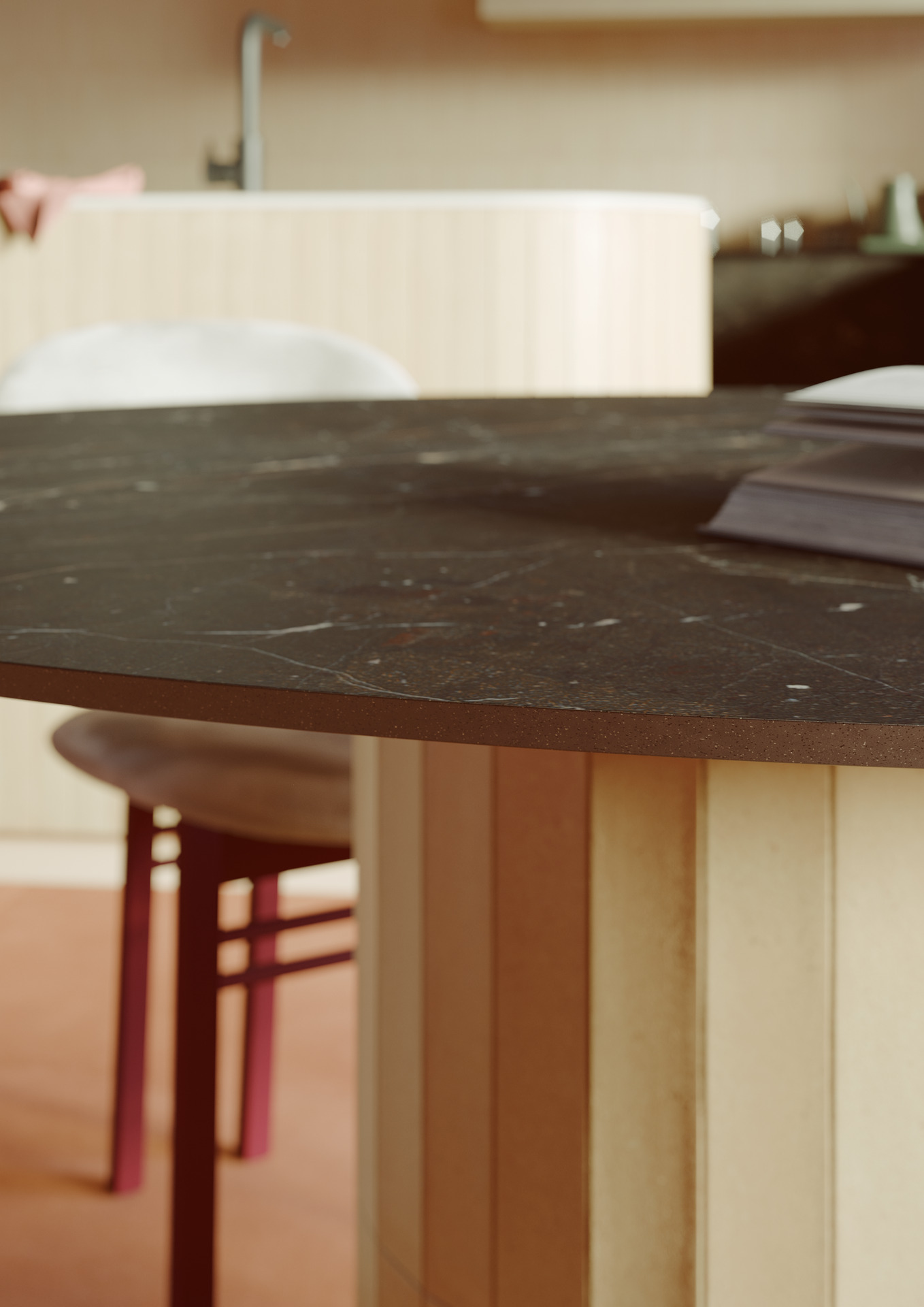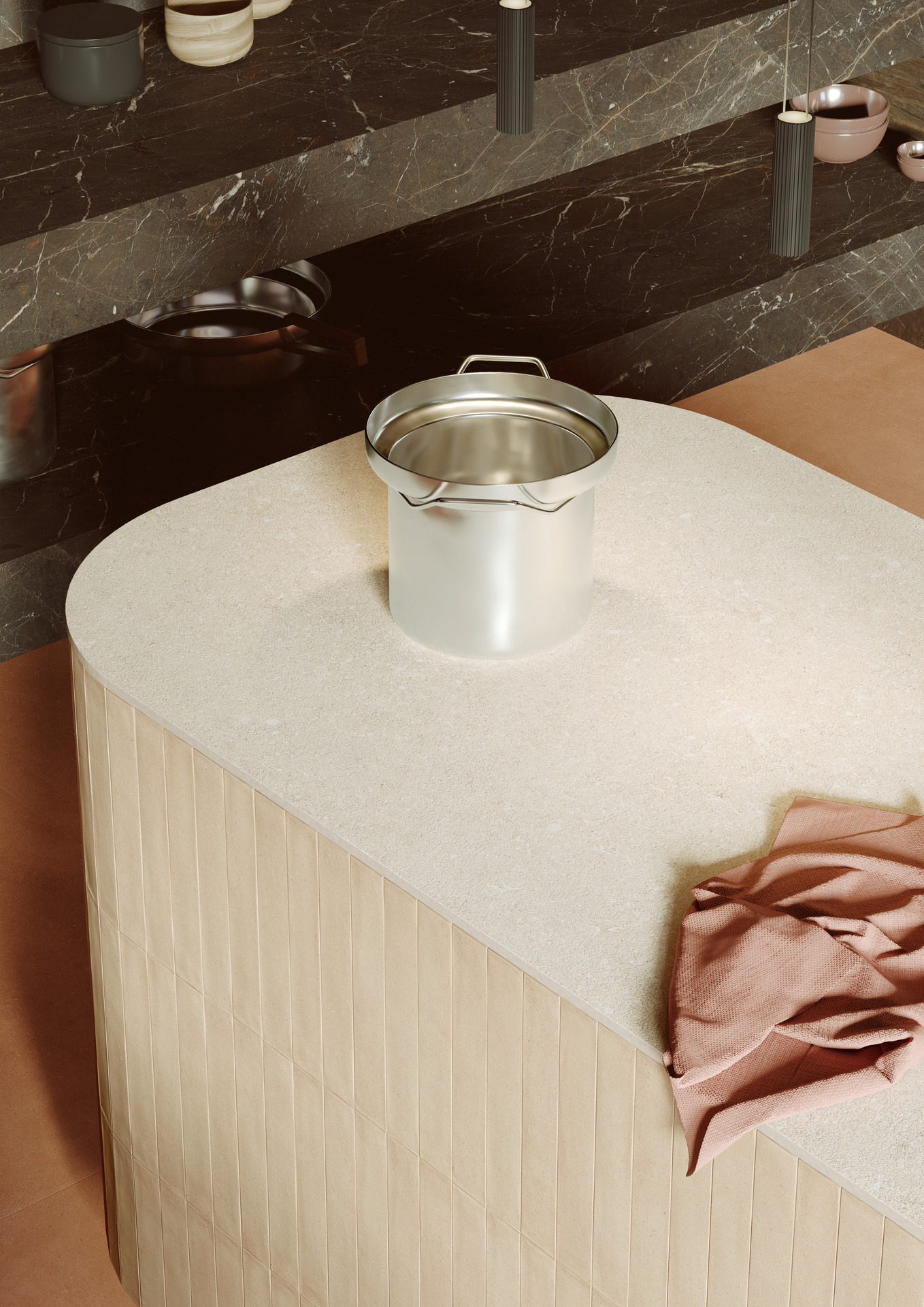 ArtCraft, Lux, Slow and The Top Stone Look (Berici was used on the countertop of the island) combine in a mix & match of different interpretations of porcelain stoneware. Corresponding in their colour shades, they vary in texture. With the surface finish achieved by the 3D Ink technology, porcelain stoneware acquires a tactile as well as a visual identity.