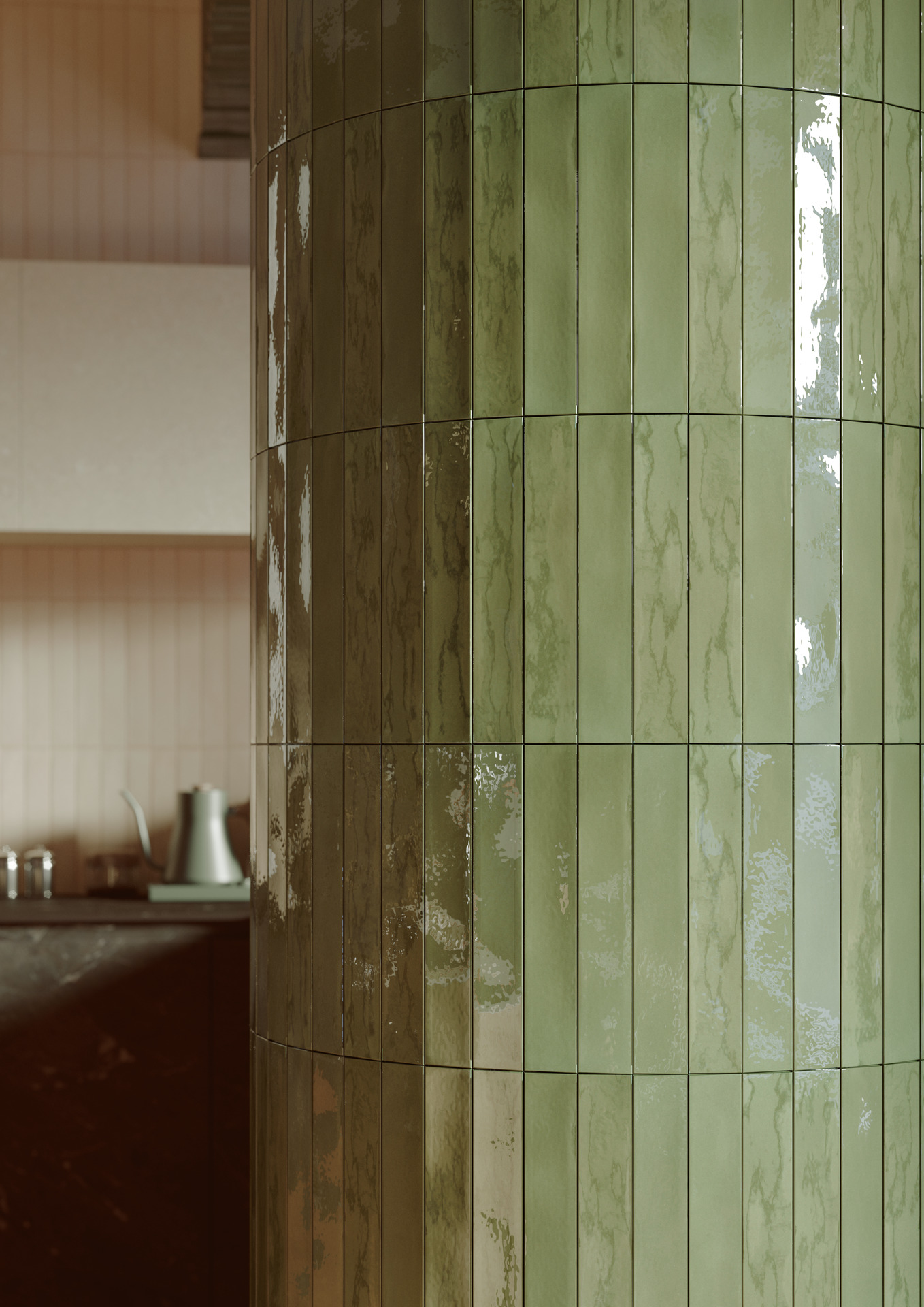 Perhaps the most room’s most striking feature is the pillar clad with small-size Crogiolo Luz tiles with their super-glossy glaze. The pillar is a reminder of the structural or utility elements with which an accommodation often has to be reached in retrofit projects. In this case, it is emphasised through the use of green, continuing the same covering on the architrave to transform the pillar into the room’s most distinctive feature.