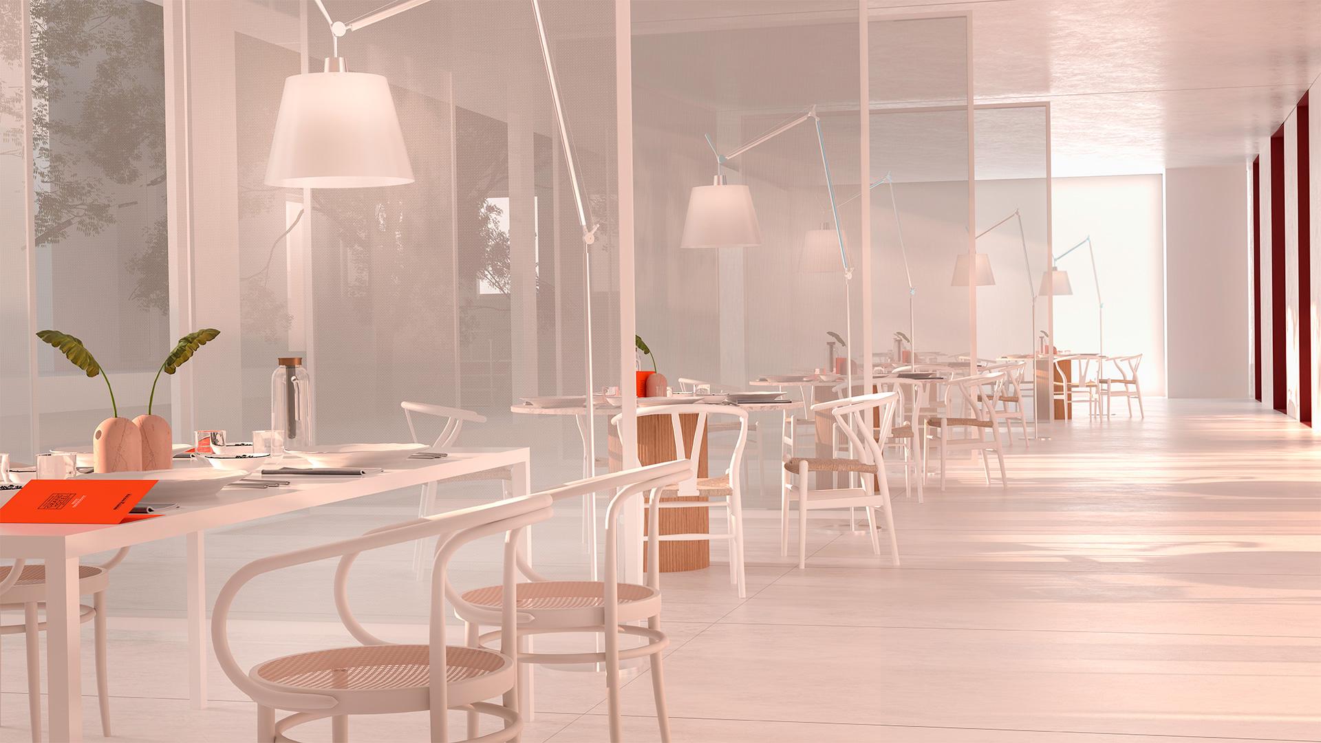 The restaurant welcomes guests in an interior finished with Grande Solid Color look White, the glamour of gleaming yet compact total white, conceived for large, seamless surfaces.