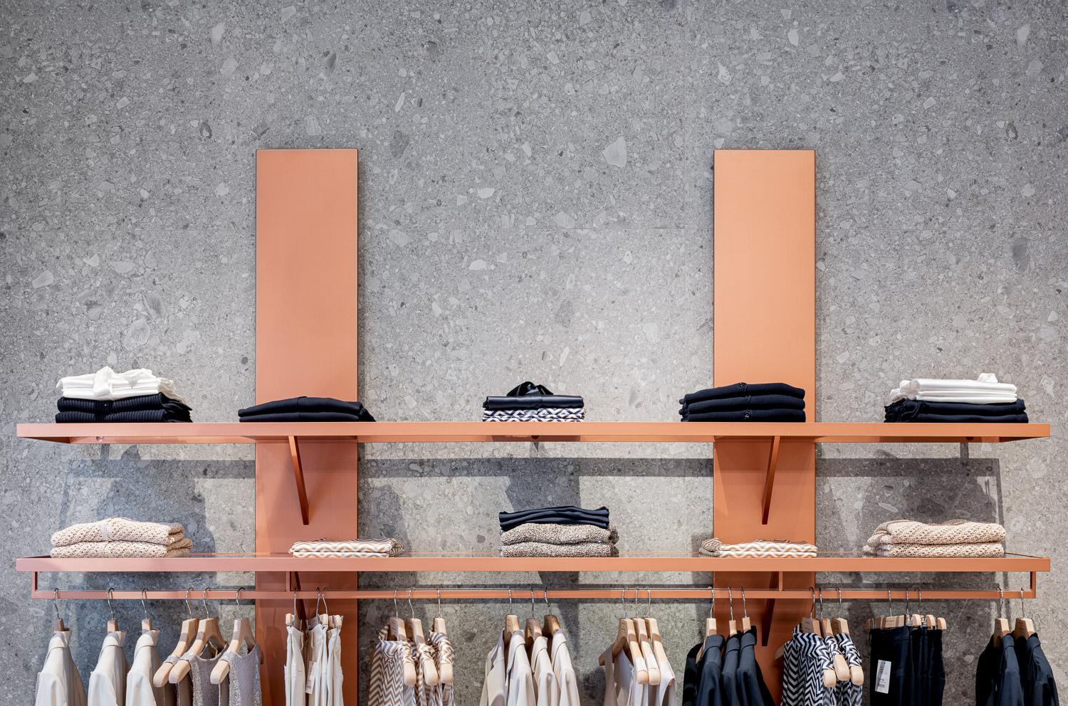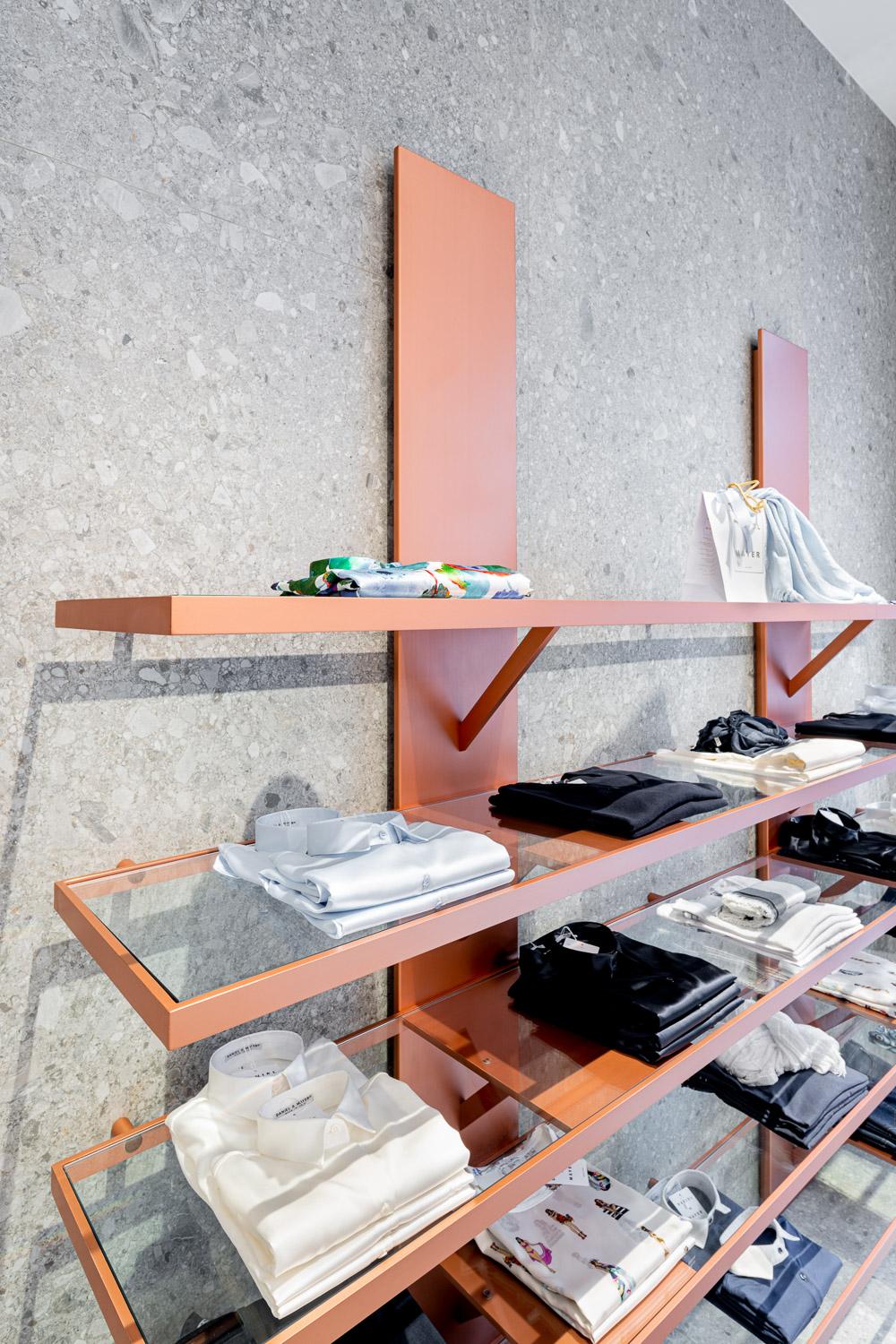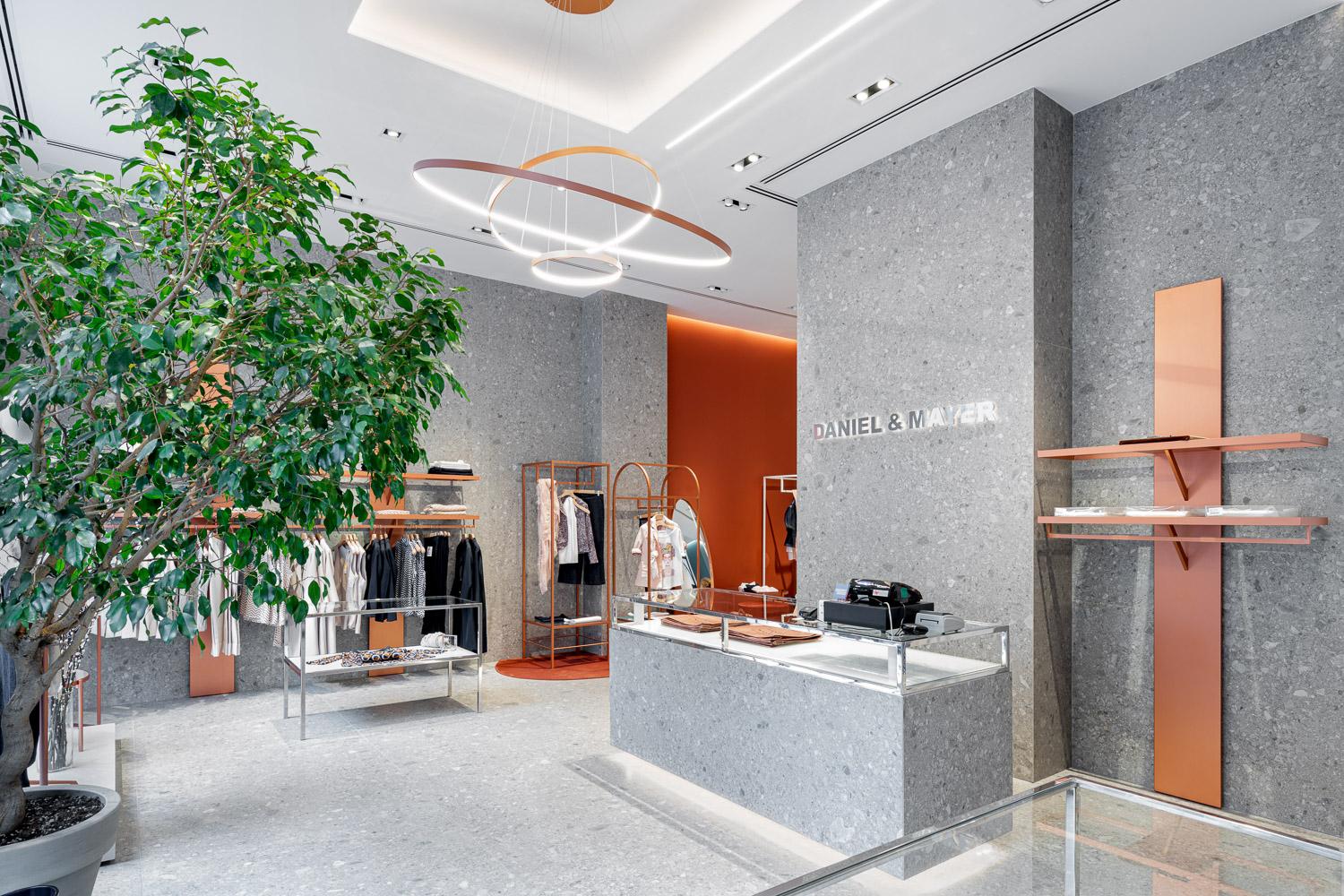 Refinement, one of the brand's core values throughout its history, is initially represented in the entrance area through a total look created in the stone-effect stoneware of the Grande Stone Look Ceppo di Gré collection by Marazzi, which covers the walls, the floor and the central payments counter. “The visual and tactile impressions of this stone, typical of the Milan tradition," Luca Sormani explains, "express the exquisite taste, which never strays into luxury, for which Daniel & Mayer has always been famous. We combined this tactile grey stone with its uneven texture with a furnishing system – created specifically for this location – with a bright, uniform, rosy, coppery finish.”