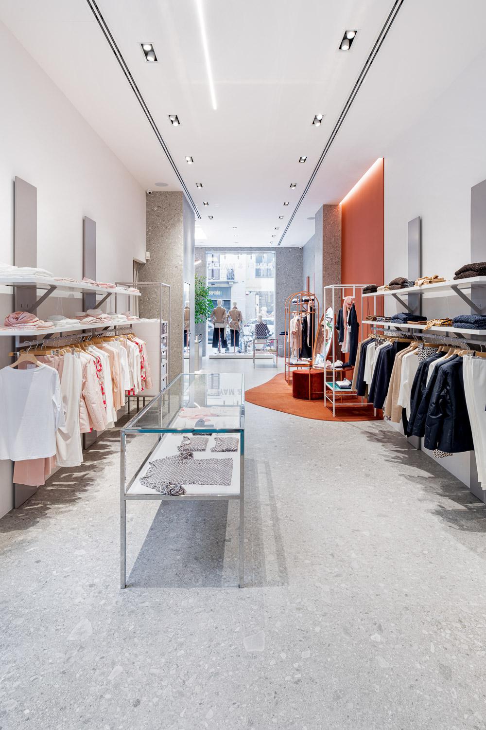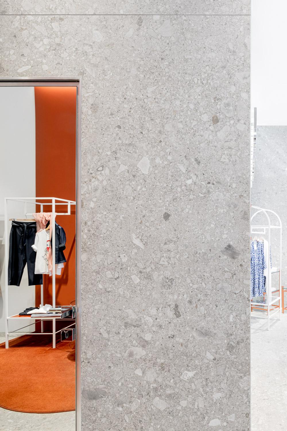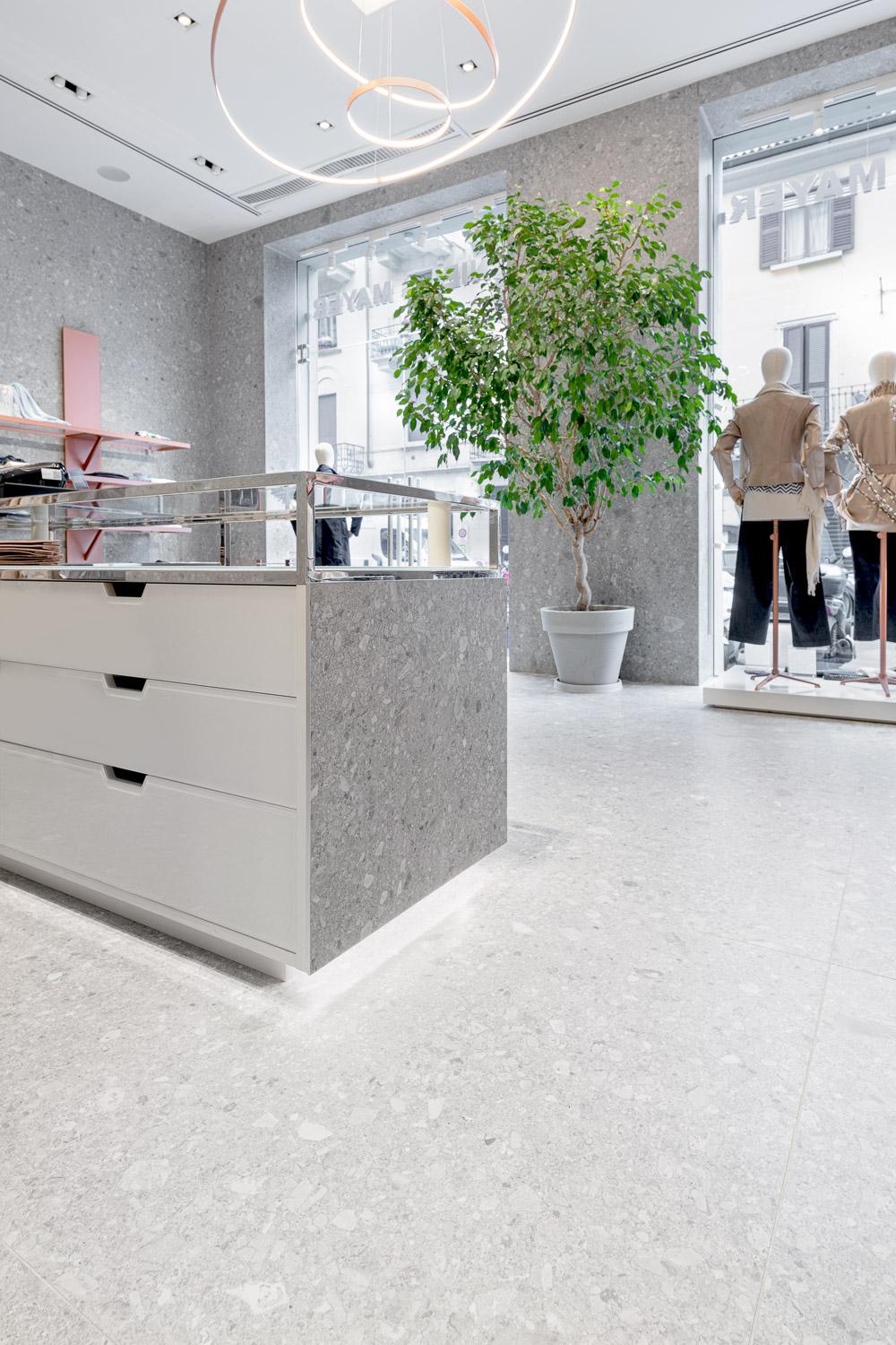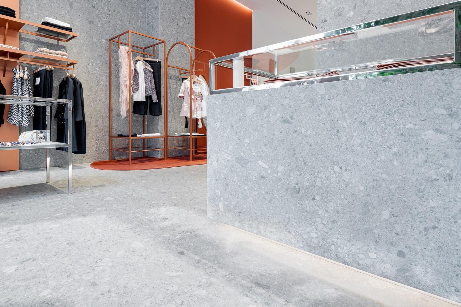Grande Stone Look Ceppo di Gré is an attractive backdrop for the Milan store's furnishings and carpeted islands