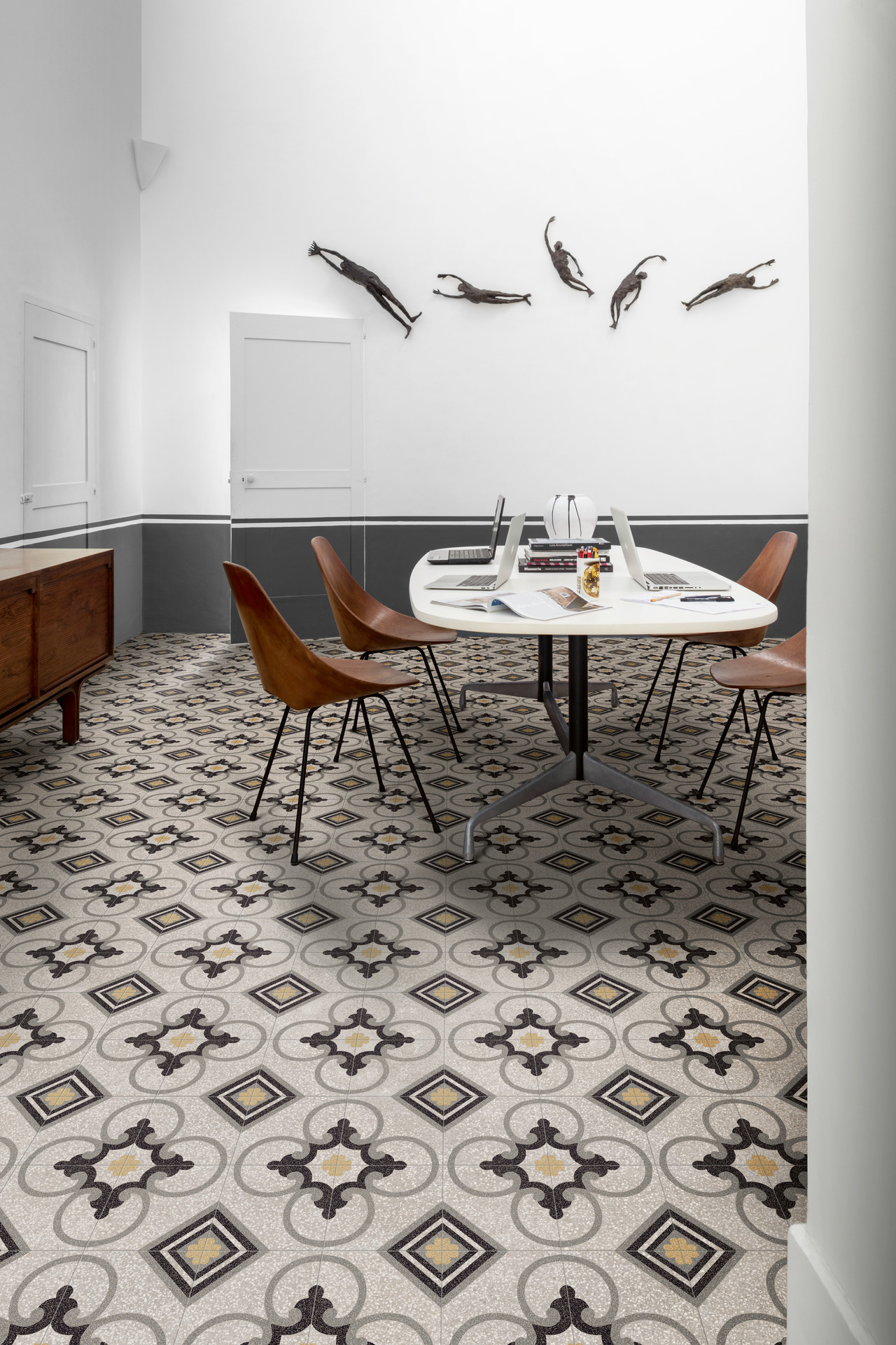 When it comes to a comparison with other materials such as parquet or laminate, the major benefit of Venetian Seminato-effect stoneware is its ability to withstand damp without warping or deteriorating over time.