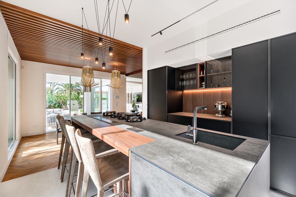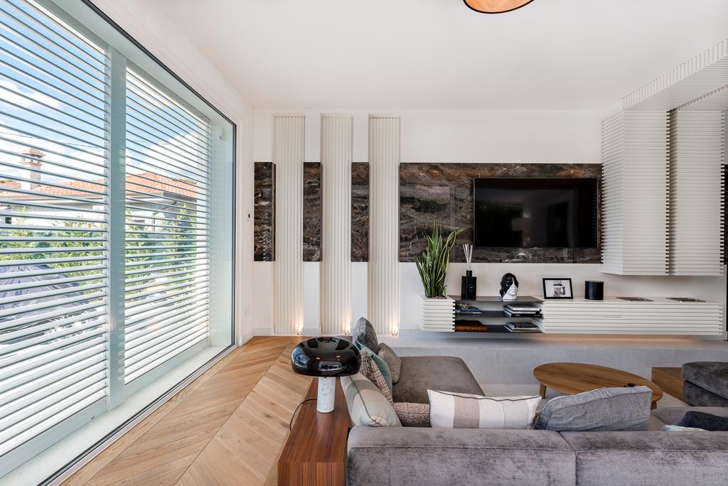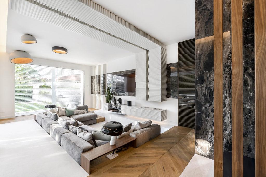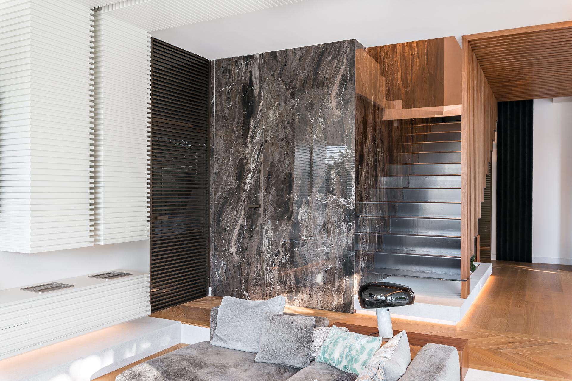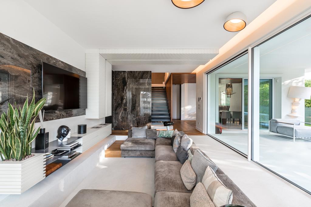Villa Anna, designed by Michele Vitaloni of Charmitaliastudio, has an interior layout featuring an original use of materials, whose elegance is enhanced by the Frappuccino texture of Marazzi’s Grande Marble Look slabs.