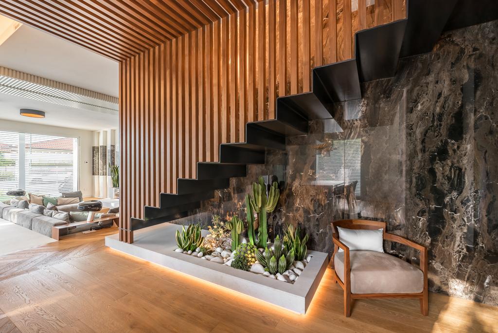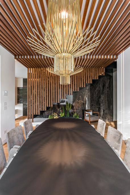 The ground floor is a generous space that unites the social areas – living room, dining room and kitchen – enhanced with columns, containers and planters covered with “Rigato MV”, used as decorative elements in a deliberately minimal environment. The ceiling features an original interplay of wooden strip tiles, which run from horizontal to vertical to define the cantilevered metal staircase leading to the bedrooms on the upper floor.