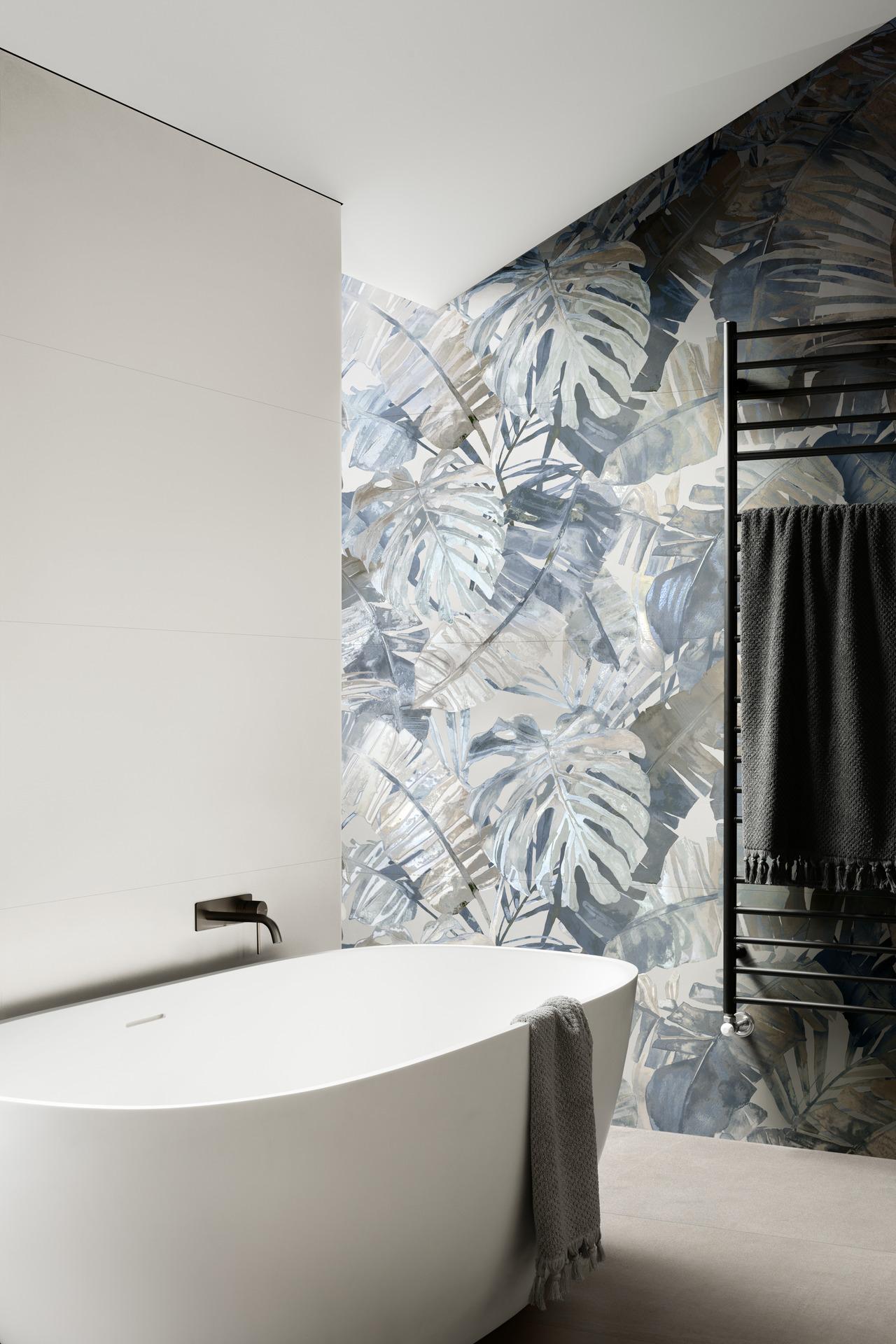 A minimalist snowy-white background for assembly with a series of decors created with latest-generation slab printing techniques. The new White Deco collection, in 60×180 cm size and slimline thickness, establishes creative dialogues, stunningly expressed in the straight horizontal elements of the Mikado 3D structure and in the Botanica, Heyday and Jungle macro decorative motifs, with floral and jungle themes.