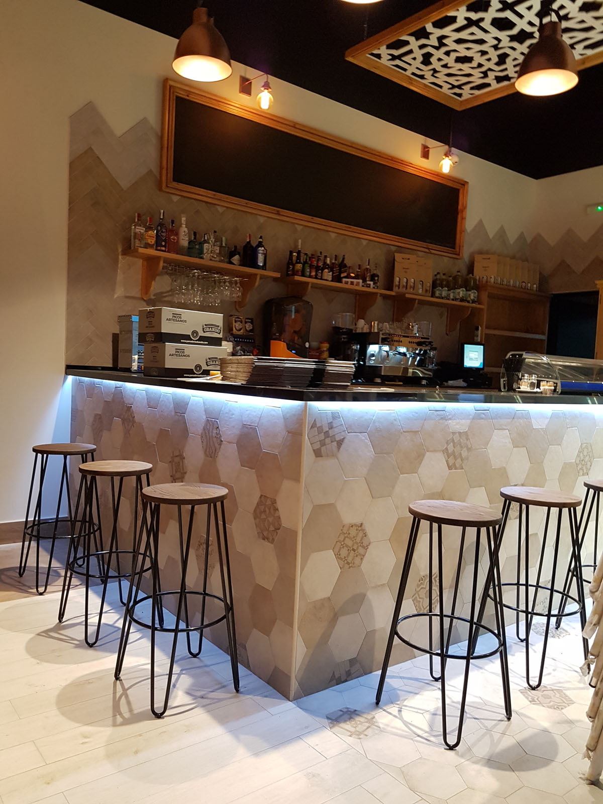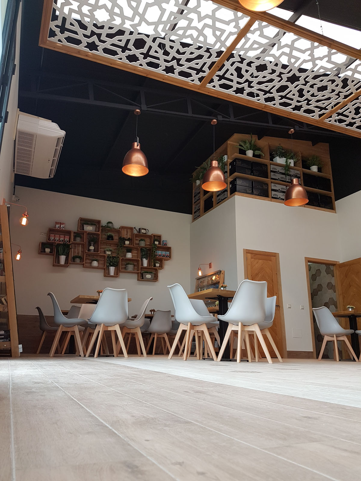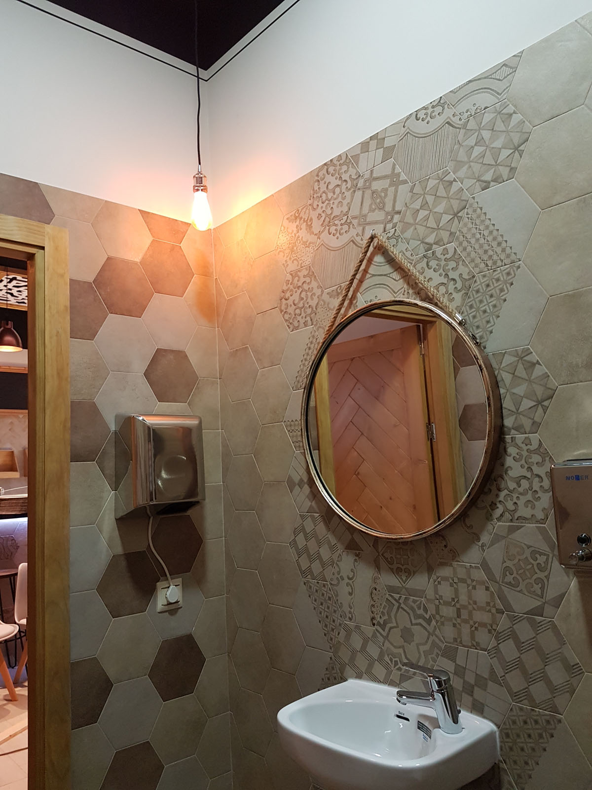 Auténtico Le Gurmé, a bakery/fast food restaurant in Utrera, Seville, was designed by the Antonio Ternero Interiorista firm with a style that offers a contemporary evocation of the Andalusian decorative tradition. The white finishes and wood and metal furnishings combine very attractively with the terracotta-concrete look stoneware of the Clays collection and Treverkway wood-effect stoneware. Clays, used in both hexagonal and brick sizes, features in the bar area (wall and counter) and the restrooms and dialogues with the Treverkway wood-effect stoneware, also installed both on the floor and on the walls. The two Treverkway wood-looks, Rovere and Acero, give the room an appealing natural warmth and create a fascinating two-tone effect.