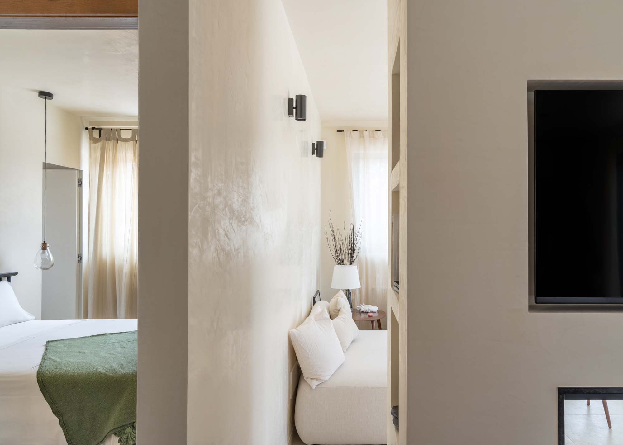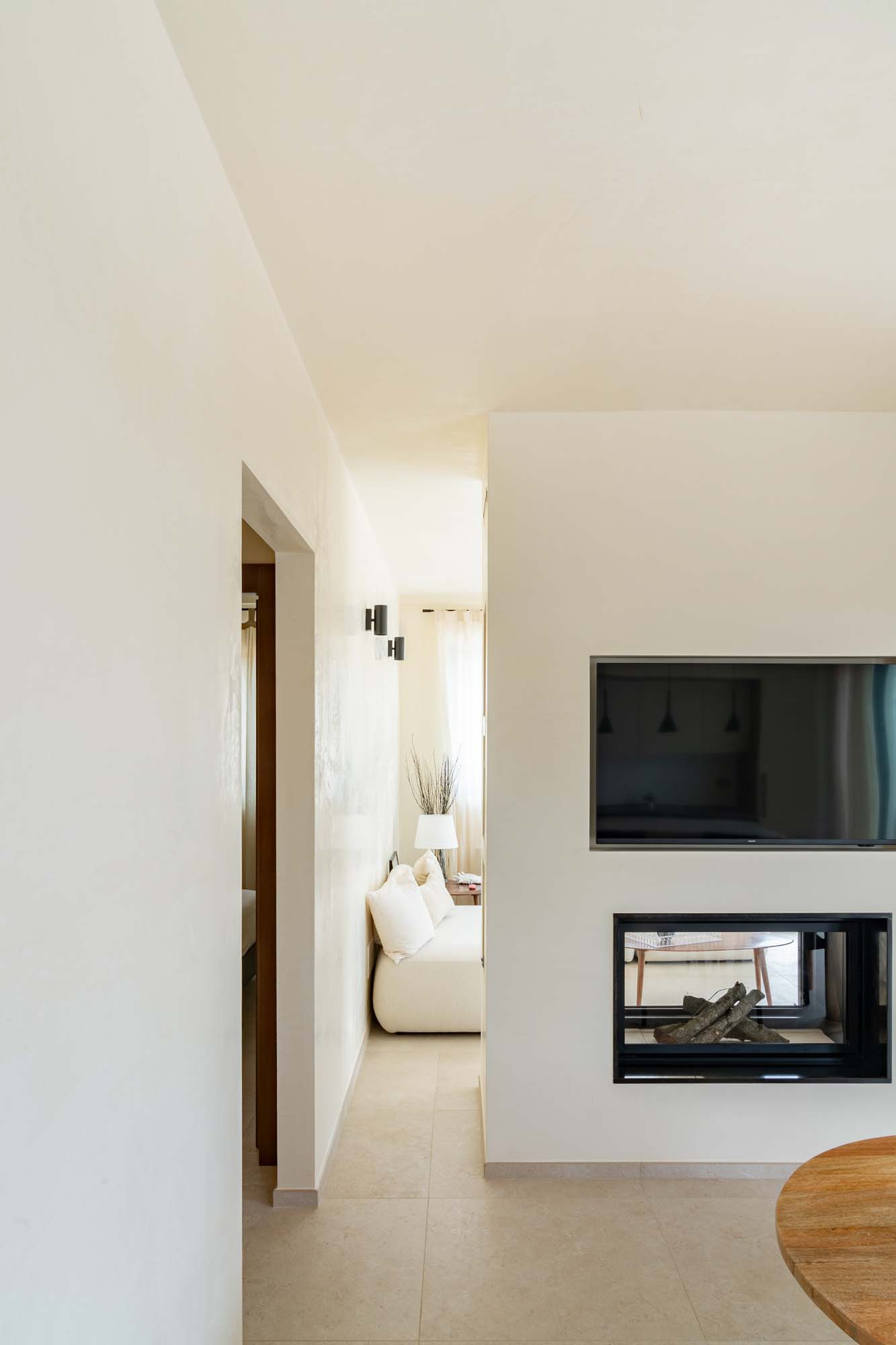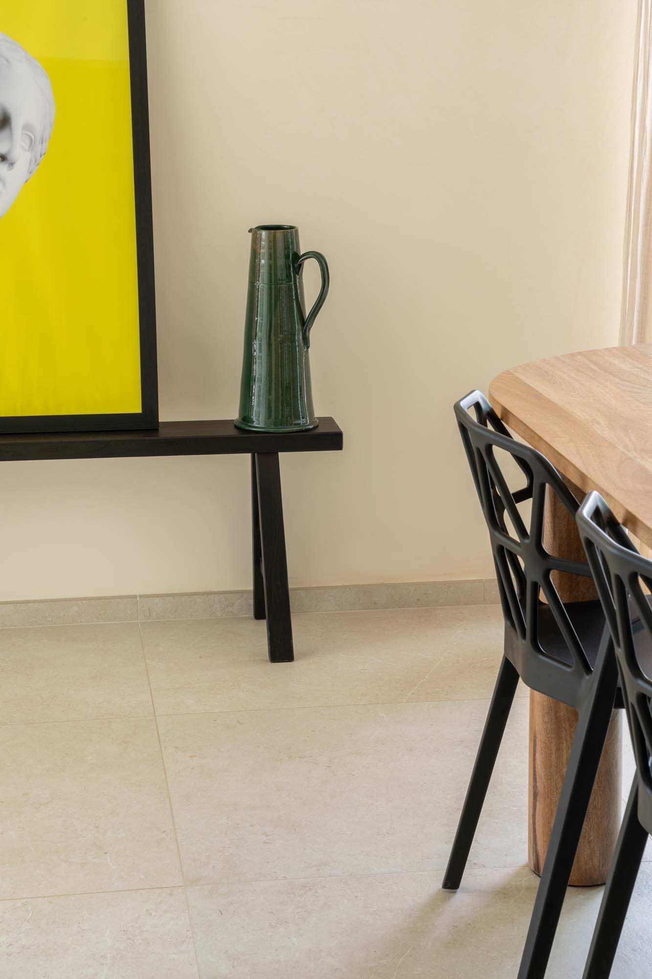 The choice of materials was fundamental for the project’s success. Mara Prezioso opted for Marazzi ceramic coverings – to be specific, Mystone Limestone stone-effect porcelain stoneware in the gleaming Ivory colour – for the floors of the entire home. This product was chosen for its efficacy in emphasising the contrast between the rough-hewn stones of the “trulli” buildings and the modernity of the interiors. With its warm, natural shades, the Mystone Limestone collection combines to perfection with the stone walls and wooden features to create a comfortable, refined ambience.