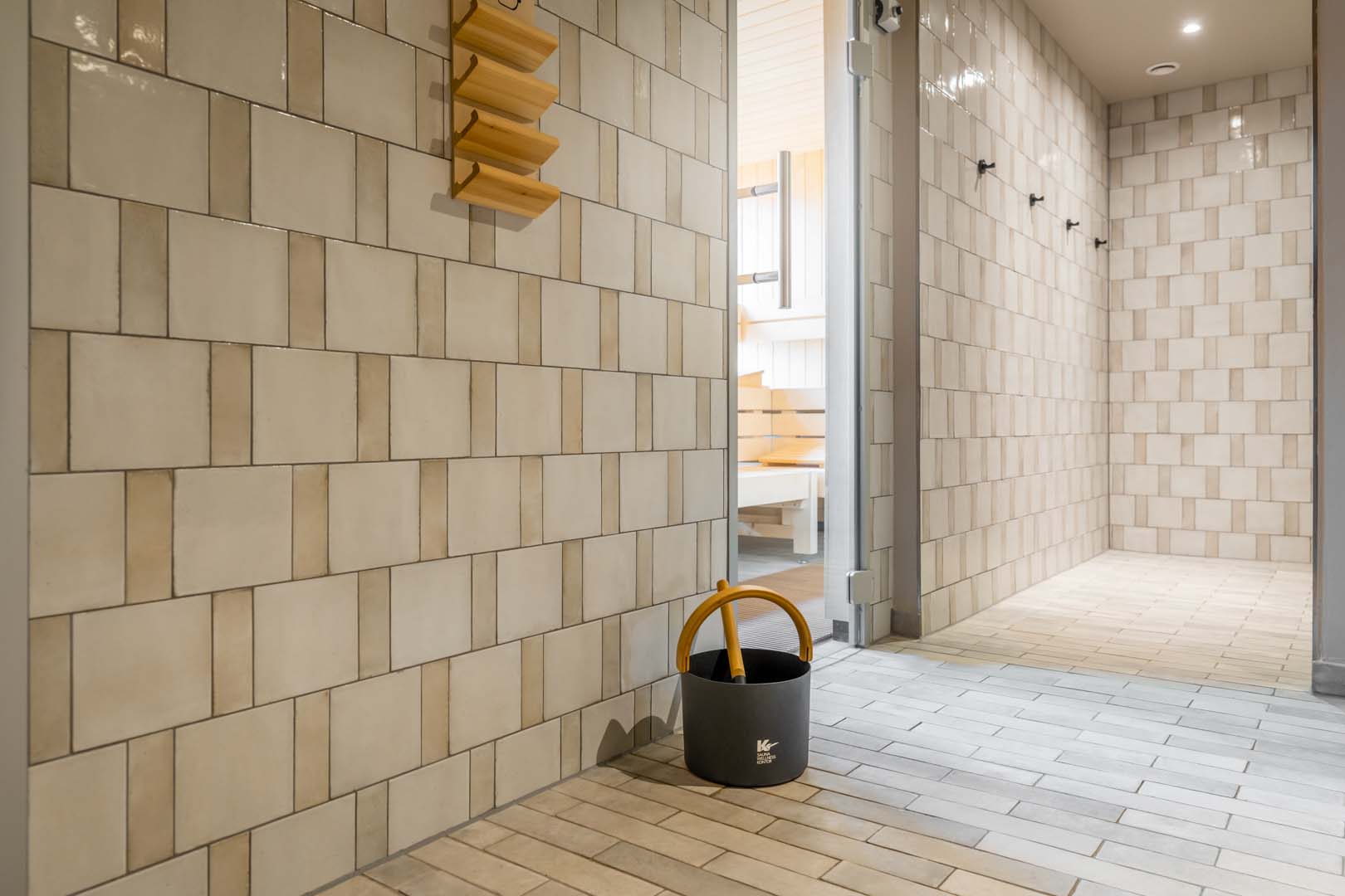 In the spa, the alternation of sizes and colours in the Crogiolo Rice collection, in the Bianco 15x15 cm and Natural 5x15 cm versions, makes the walls vibrant and dynamic, while the Terramix collection in the Bianco colour, stoneware brick tiles with a Nordic style in the 7x28 cm size, was used on the floor. The same collection was also installed in the bar in the Beige version.