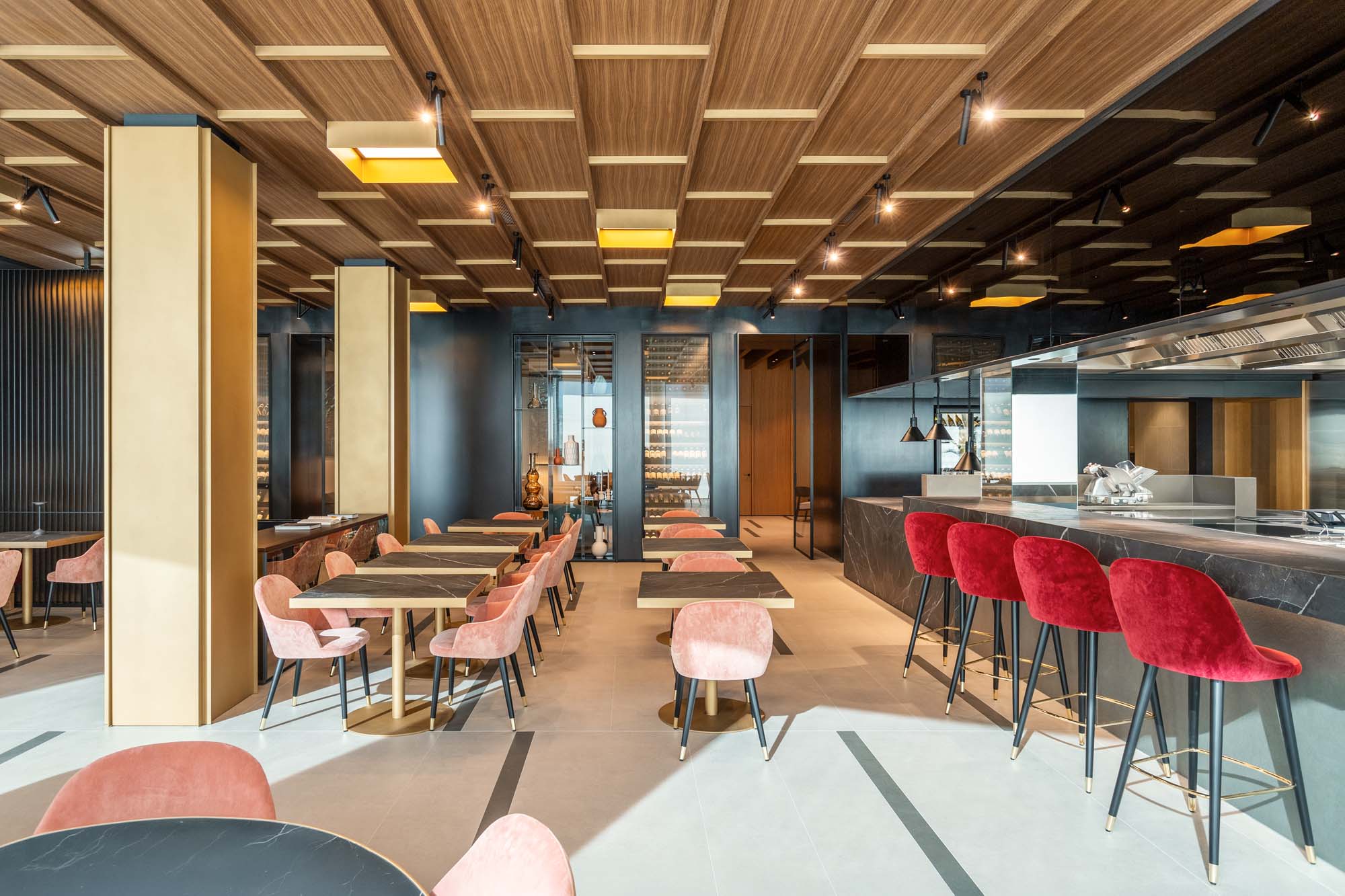 “The hotel’s location is unique, close to the Casino and some of the most beautiful beaches in the area,” explains Matteo Pasquini, chief architect and project manager at Q-BIC studio, founded in 2005 by brothers Luca Baldini, architect, and Marco Baldini, designer. “The architectural element was renovated according to the design by the Calvi Ceschia Viganò studio, based in Sanremo. For the furniture contract, we entrusted the company Hi Contract Brugnotto Group. A highly meticulous design process was undertaken, with bespoke drawings for many of the finishes, including ceramic surfaces.”