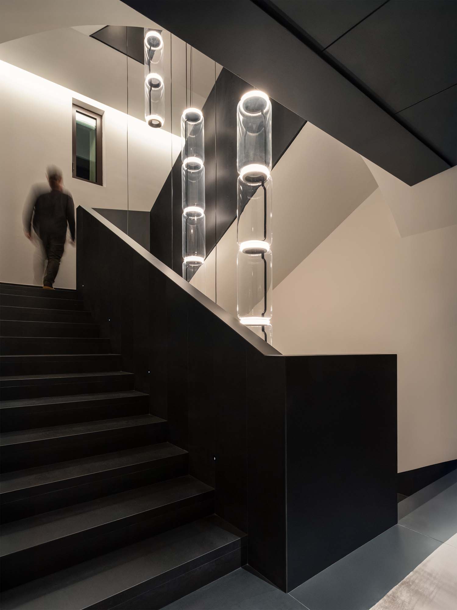 For the staircase, to which the firm wished to impart a minimal and rigorous image, the Metal Look collection was selected in the Iron Dark variant, both for the flooring – including the corridors – and for the balustrade.