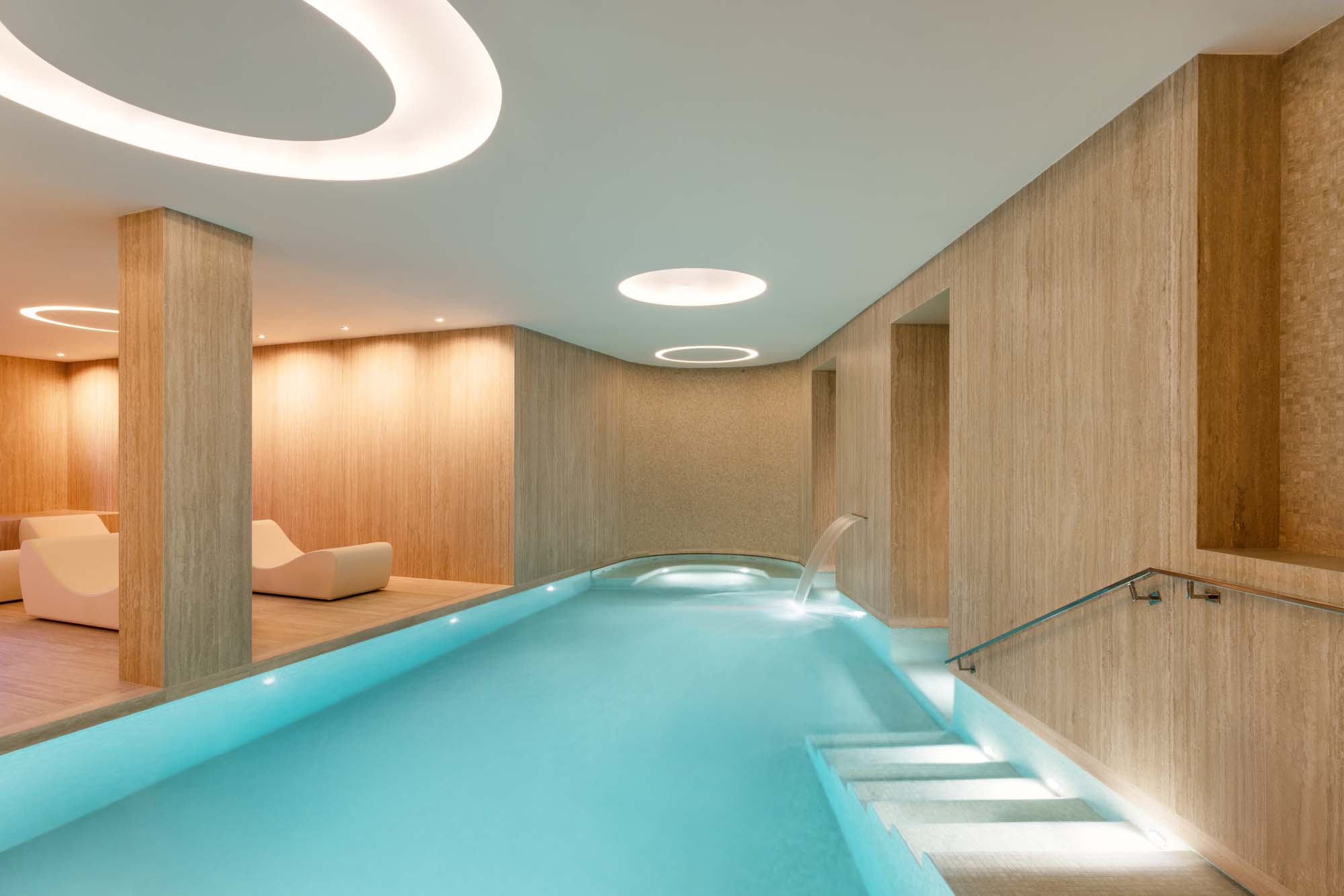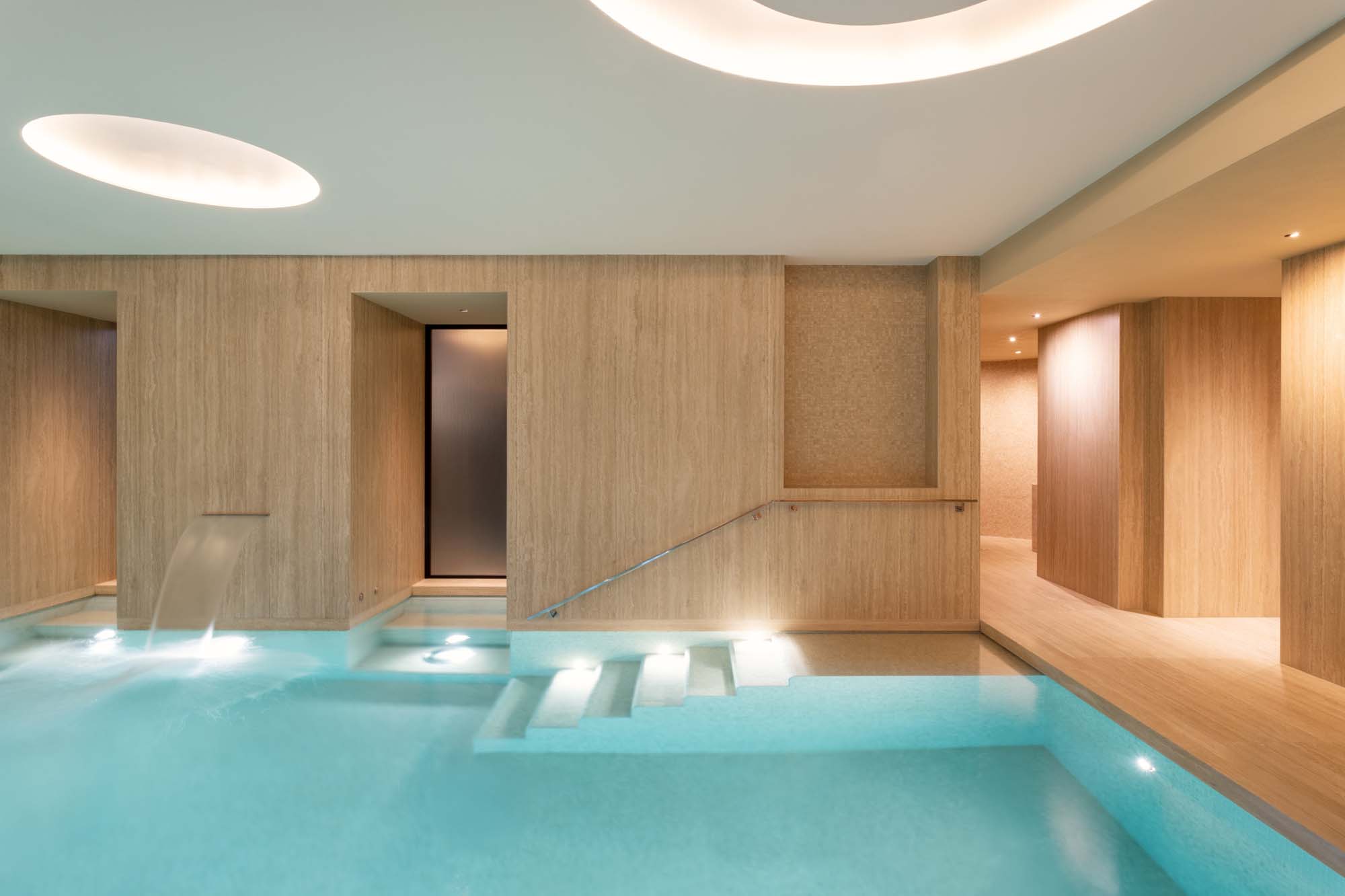 Secluded and immersed in a realm of absolute wellbeing, the spa area is situated in the basement. The client had already seen and appreciated the Travertino Classico collection, and brought it to our attention. We therefore decided to install the large slabs at full height, on the walls, as well as on the floors. The result is astonishing, as is the aesthetic quality of these surfaces which, in their stony compactness, evoke the Italian construction tradition and the spaces of ancient thermal baths.