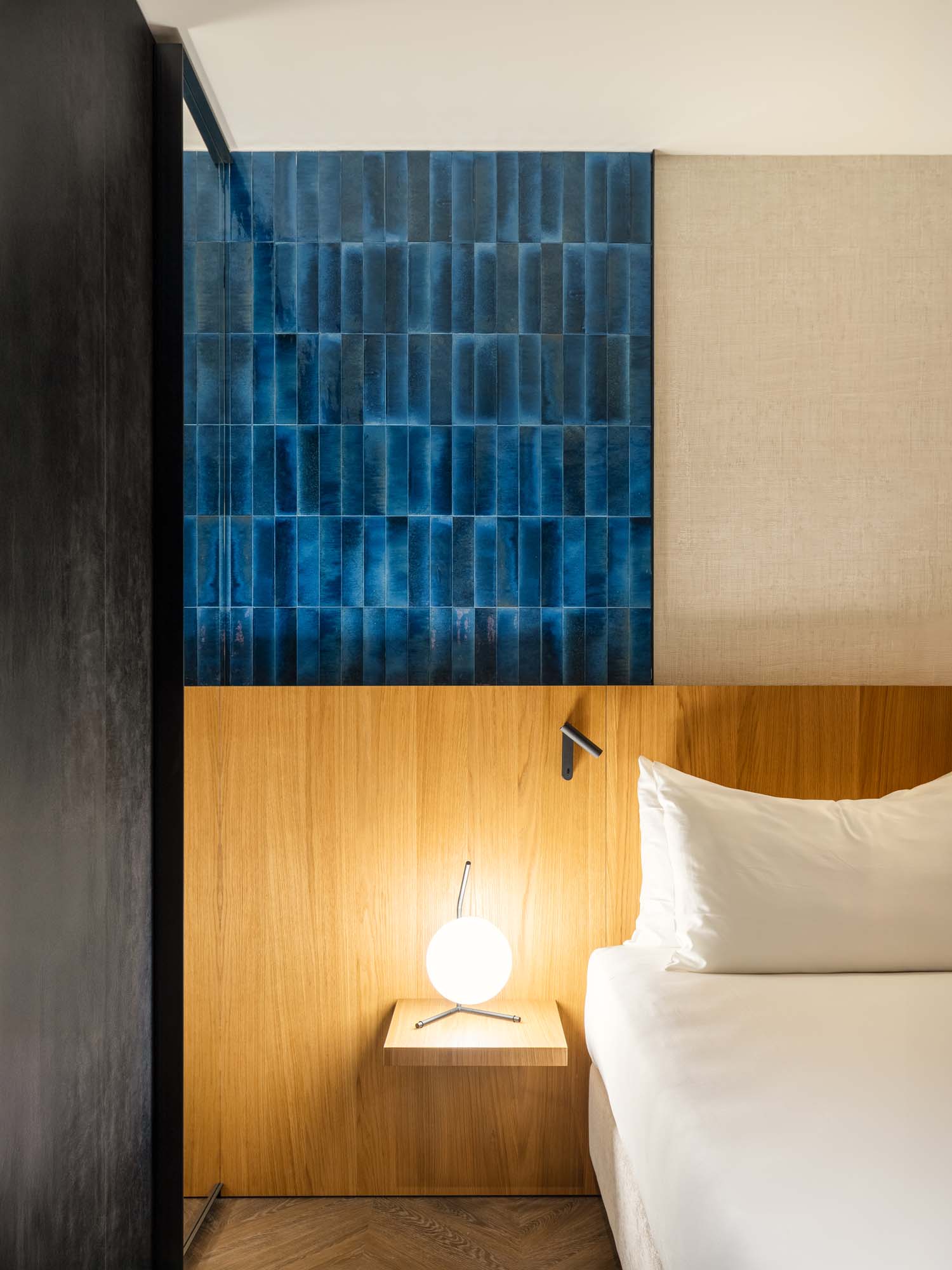 Complete compositional freedom in the rooms and wide choice of colours. On the walls at the head of the beds, reflected in the corner gaps, five colours from the Crogiolo Lume porcelain stoneware collection have been incorporated, featuring the characteristic gloss of handmade maiolica bricks: China, Forest, Pink, Turquoise and Musk.