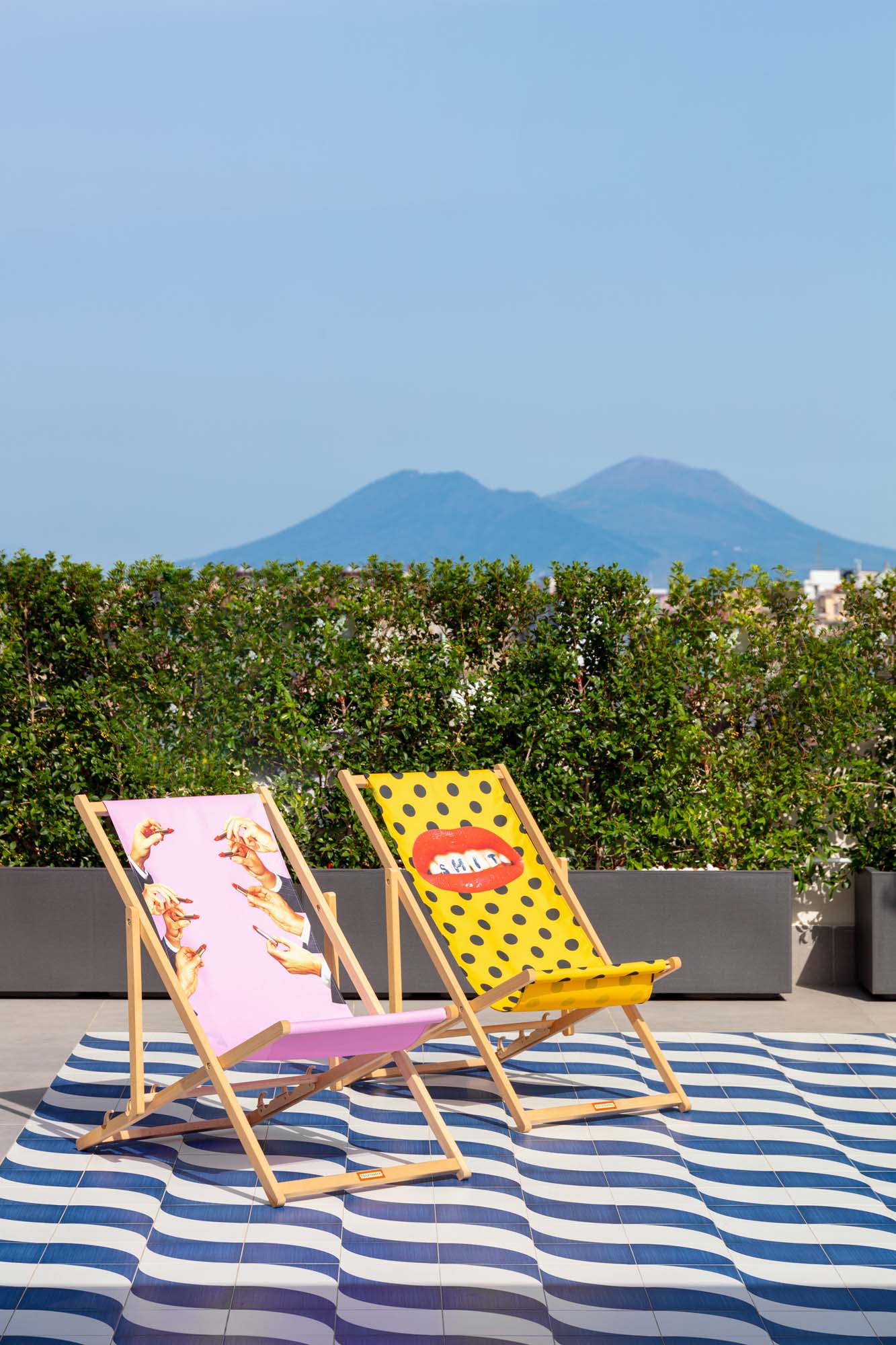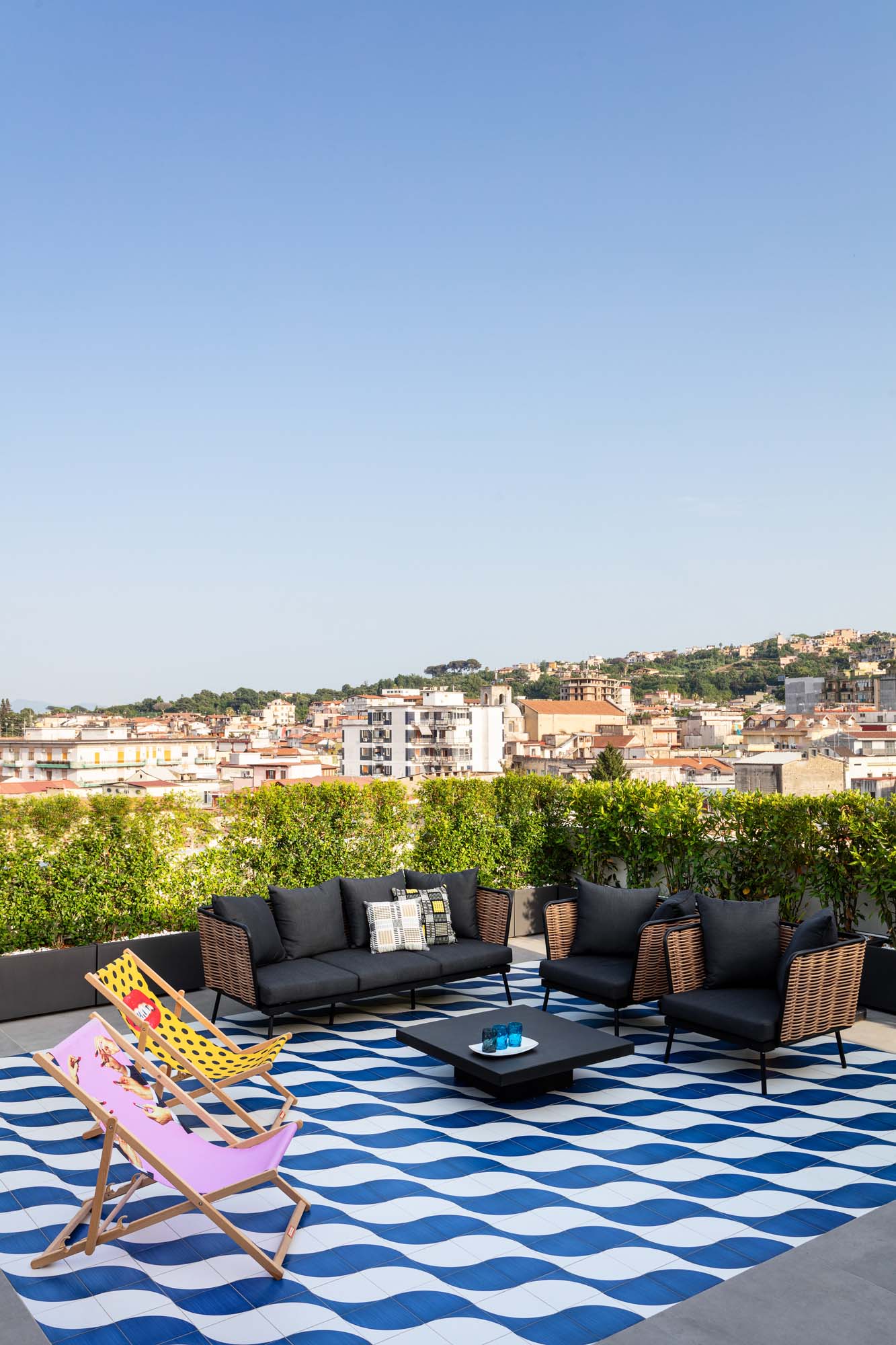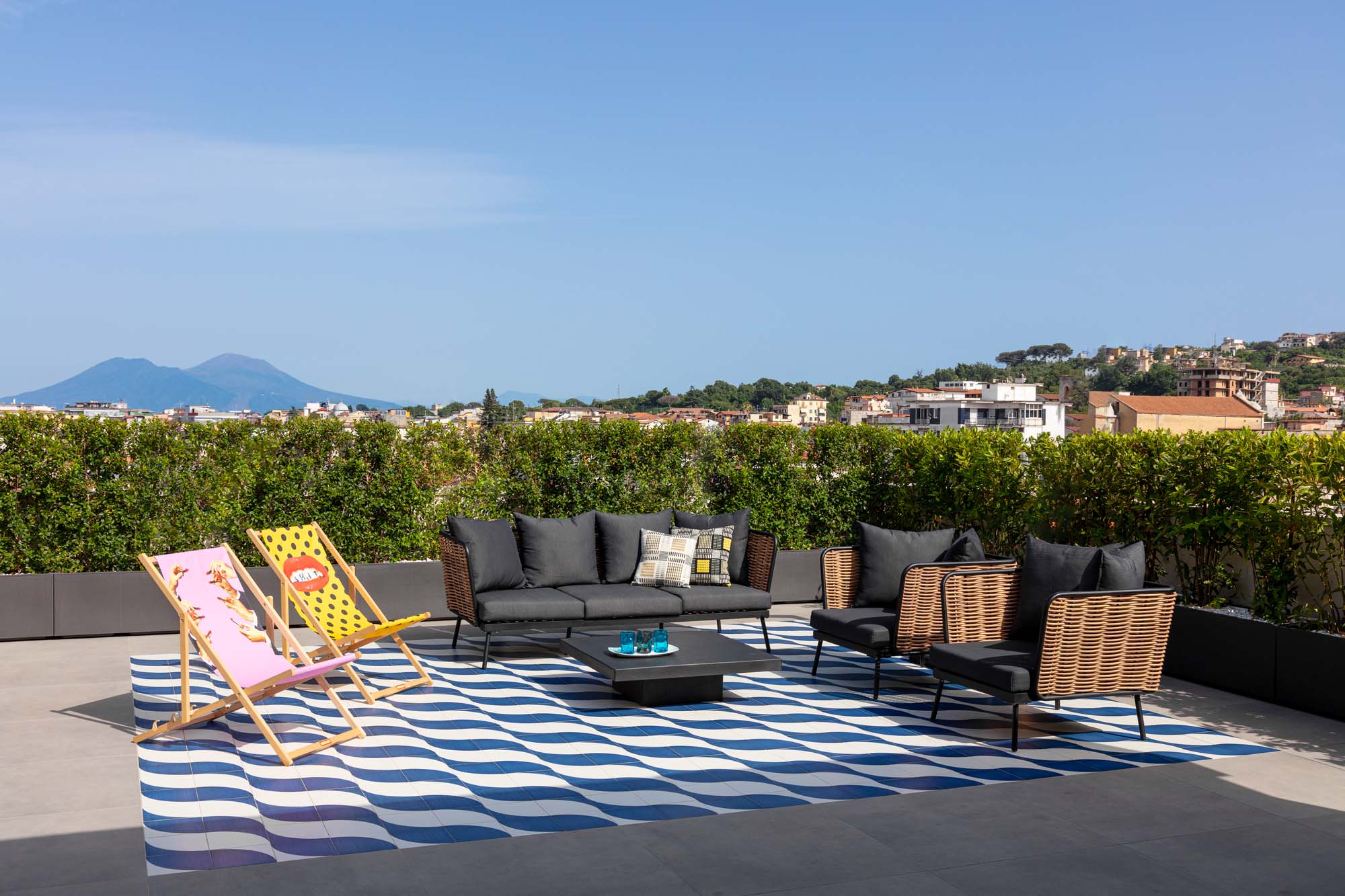 “I wanted to create continuity between the context and the outdoor area of the house,” explains the designer who carried out the project, “as well as a frame that embraces the natural elements that form the backdrop of the terrace, creating a carpet of waves on the floor. They were installed in a way that creates a very fluid and elegant movement... they are good waves emanating from Vesuvius, which dominates the landscape.”