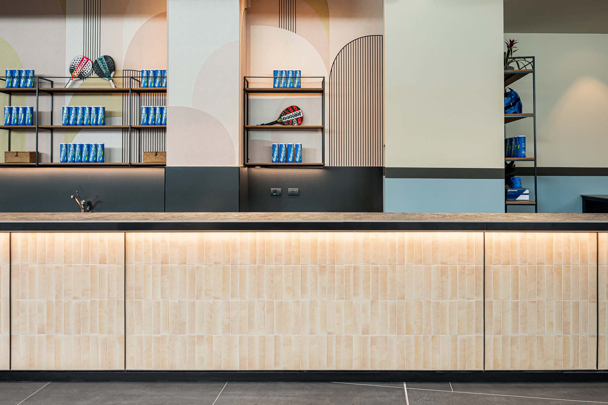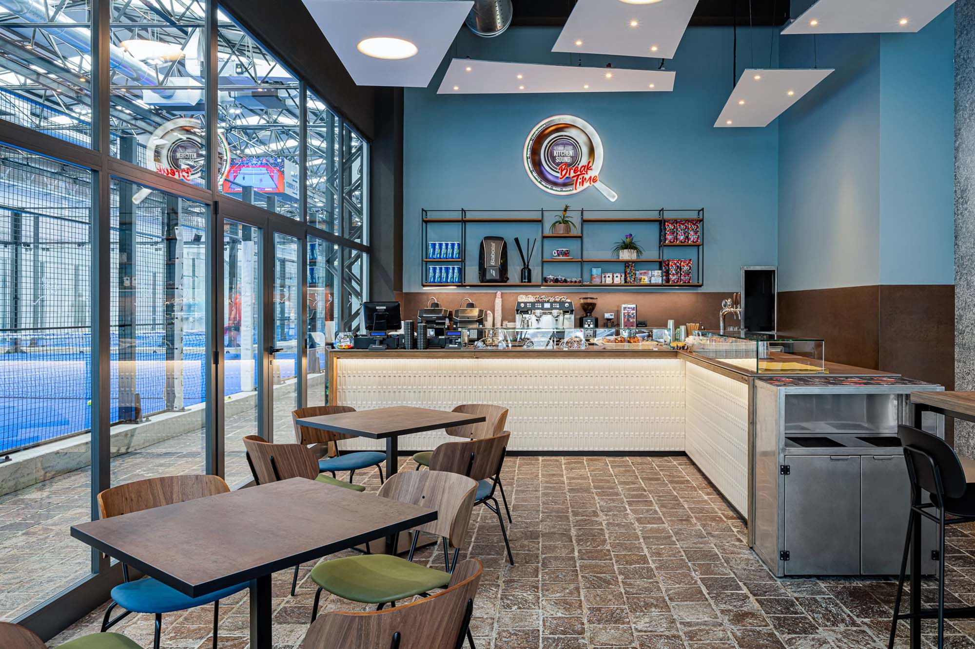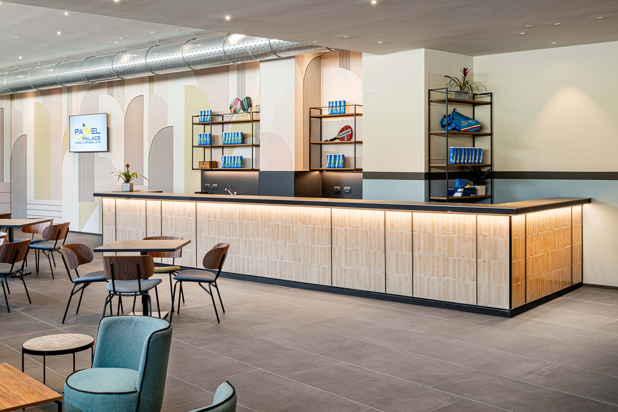 Hotel and catering, hospitality and leisureAt the Padel Palace sports club and bistro ceramics are widely used, from the coverings of the counters to the tabletops and from the material-effect walls to the floors, exploiting the many looks and sizes available