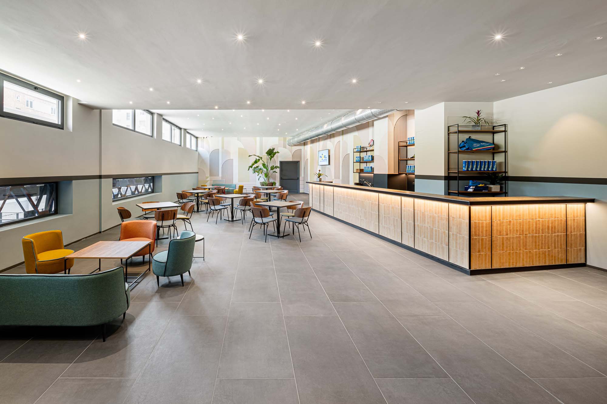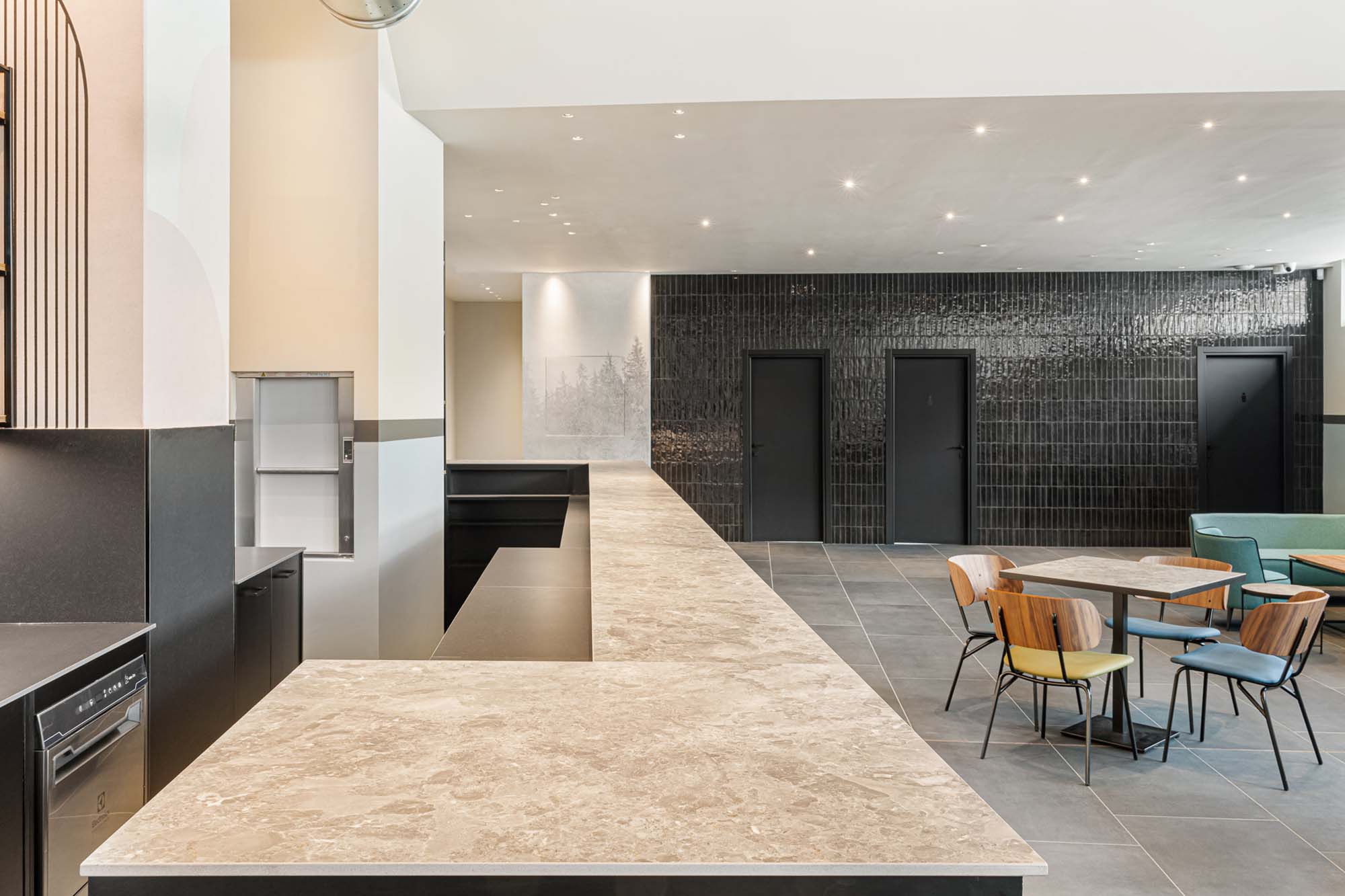 The ground floor bar is an informal room with large windows overlooking the courts. Its focal point is the large L-shaped counter, which recalls those of traditional bars with their display cases and their food on show. The front of the counter is covered with pale-coloured tiles from the Crogiolo Confetto collection in 5x15 cm size with the Savoiardo three-dimensional structure, which combines with the lighting that rakes the whole surface to generate an effect of depth and alternating light and shadow. The Top Metal Look in Corten finish (160x320 cm 6 mm and 162x324 cm 12 mm sizes), used on the countertop, the walls behind the counter and also the tops of the tables, which match the walls, provides a strong contrast with the counter front.