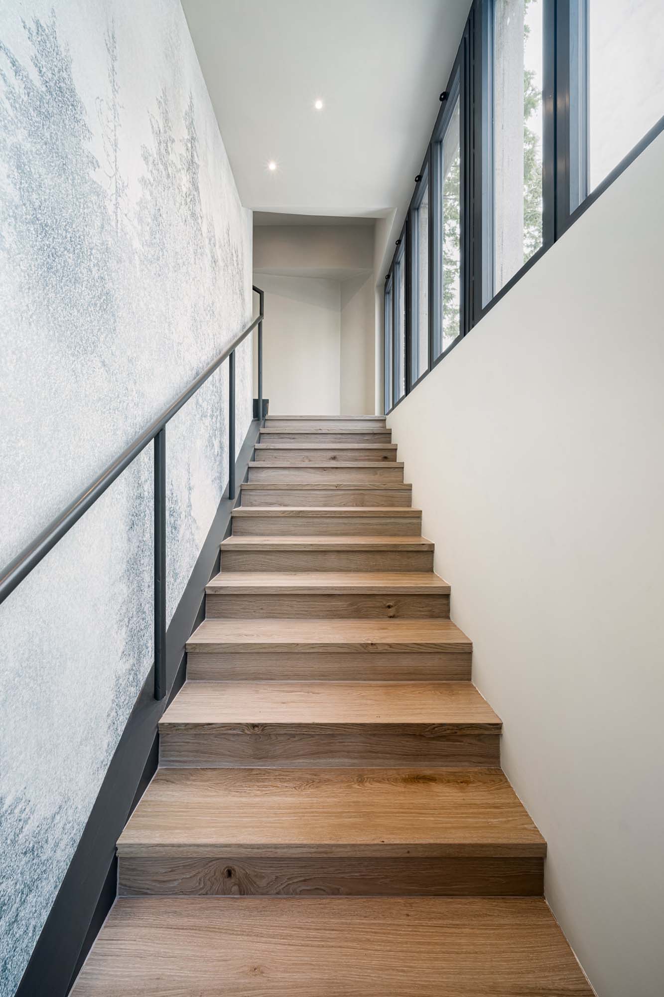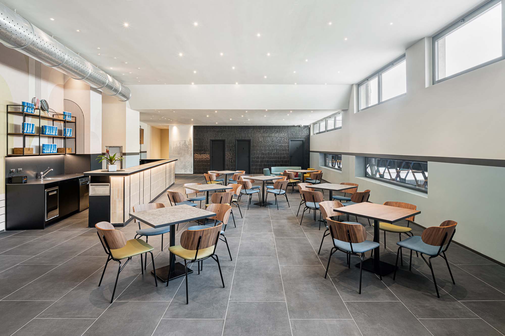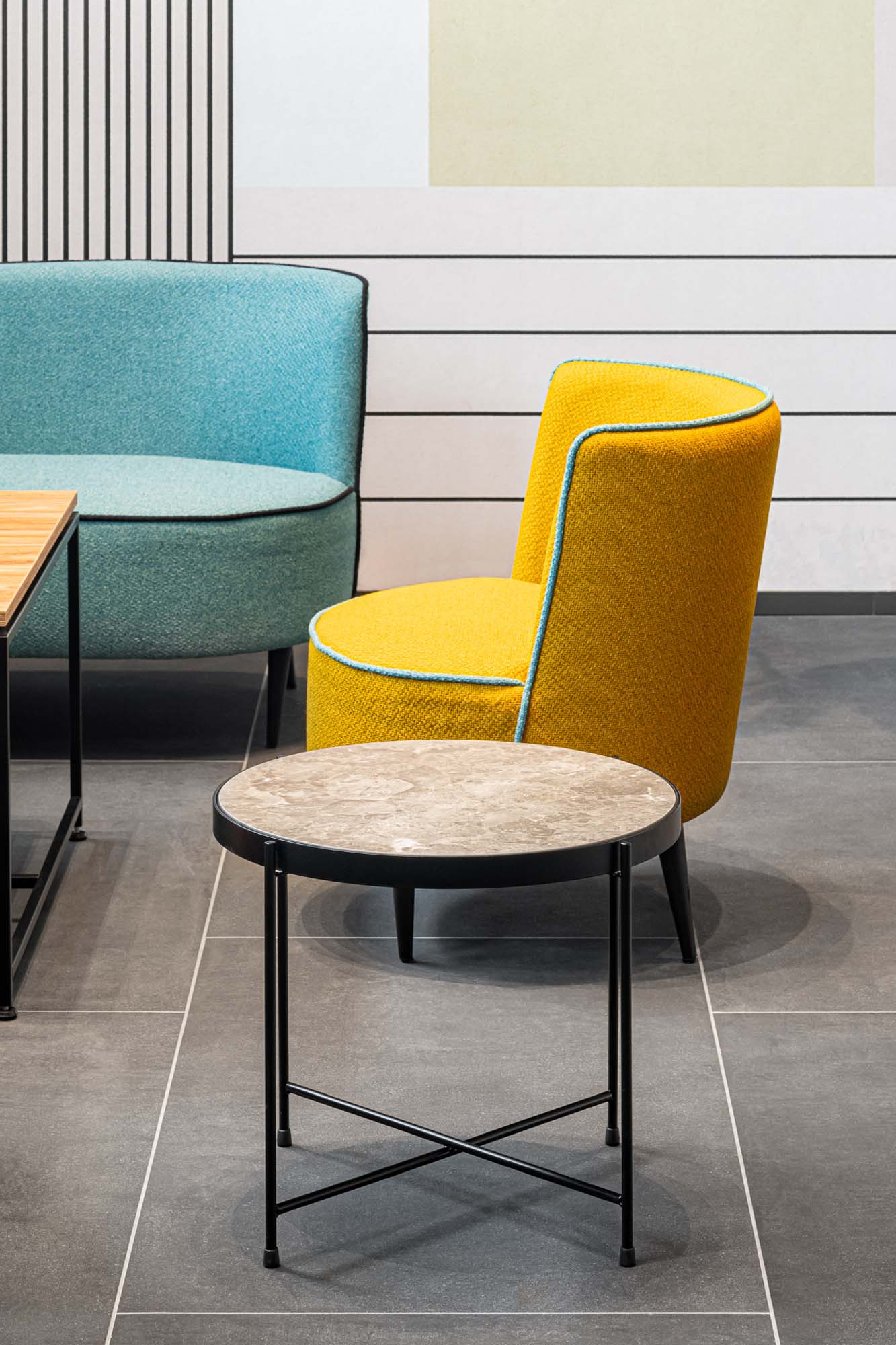 The stairs, covered with Treverkmust 25x150 cm wood-effect planks, lead to the ABKS Break Time bistro. “We decided against referencing the location’s industrial identity with the usual bare concrete in a “raw” space concept. Instead, we opted for an understated, discreet elegance, defined by the colours and textures of the materials,” Alfredo Canelli continued. The dining-room flooring is in dark concrete-effect porcelain stoneware (Cementum collection, 60x120 cm) to dialogue with the original context, from which we retained the industrial air ducts and the tall ribbon windows. The upper floor also includes a wide counter, straight in this case and covered with Lume small-size tiles from the Crogiolo range, in an iridescent pink colour. To highlight the pink of the counter’s front tiling and the stippled grey background of its top (The Top Stone Look collection, Gris du Gent colour), square Powder Graphite slabs (60x60 cm) were installed behind it. “We wanted to focus on the material effect, without interfering with the interior’s overall simplicity,” Mr Canelli added. All this clever use of surfaces and colours recurs in the tabletops.