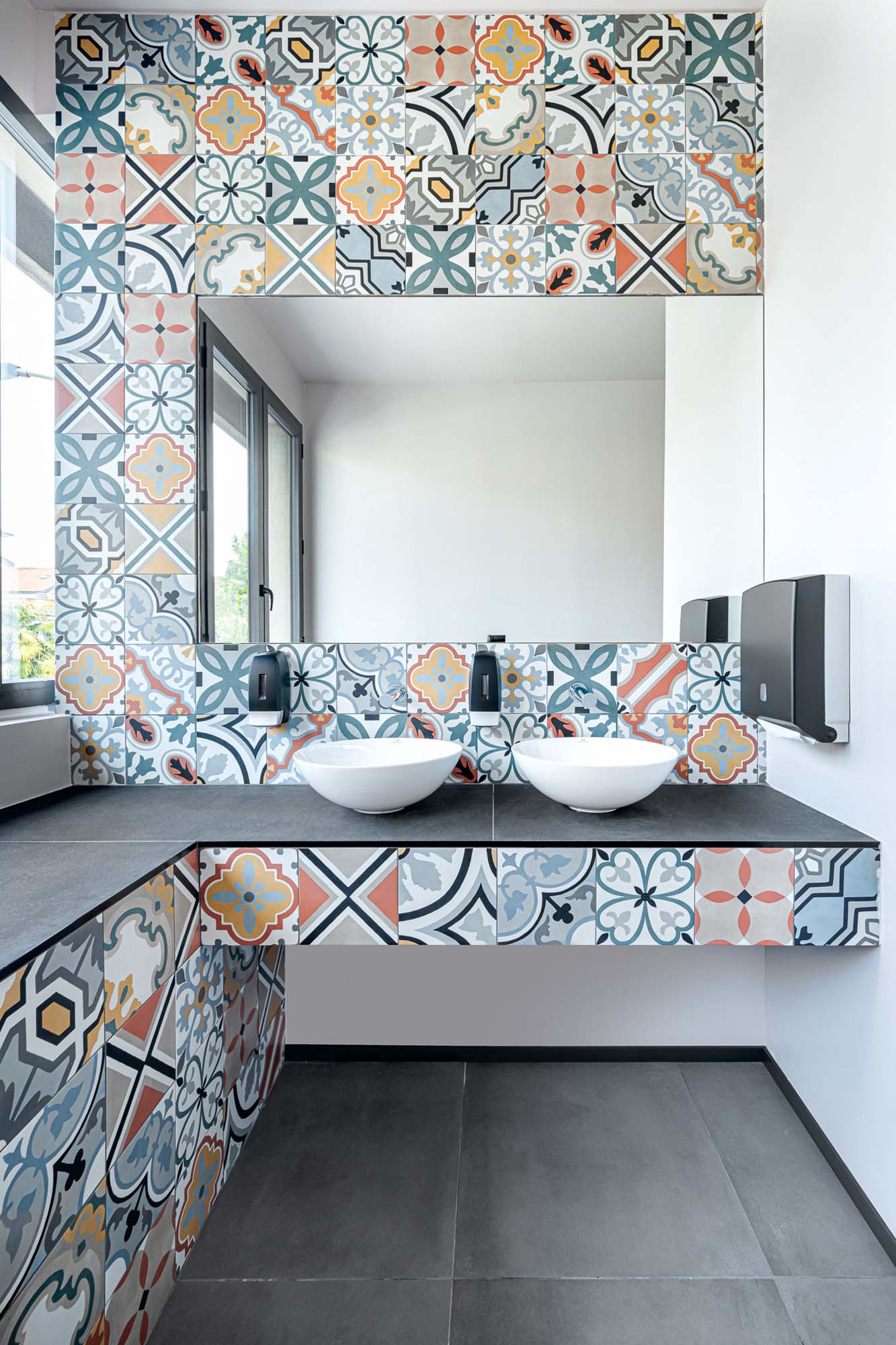 The wall at the entrance to the toilets is completely covered with black tiles from the Lume collection, creating a glossy backdrop that reflects the natural daylight which rakes the tiles from above. But the surprise comes in the lavish, playful use of the many decors of the Crogiolo D_Segni Colore collection (20x20 cm size) which, while evoking traditional cement tiles, here constitute a kaleidoscope of decorative patterns. “One curious fact”, Mr Canelli revealed: “the tiles’ layout conceals a code - the scores of the final and semifinal matches at the last three padel world championships”.