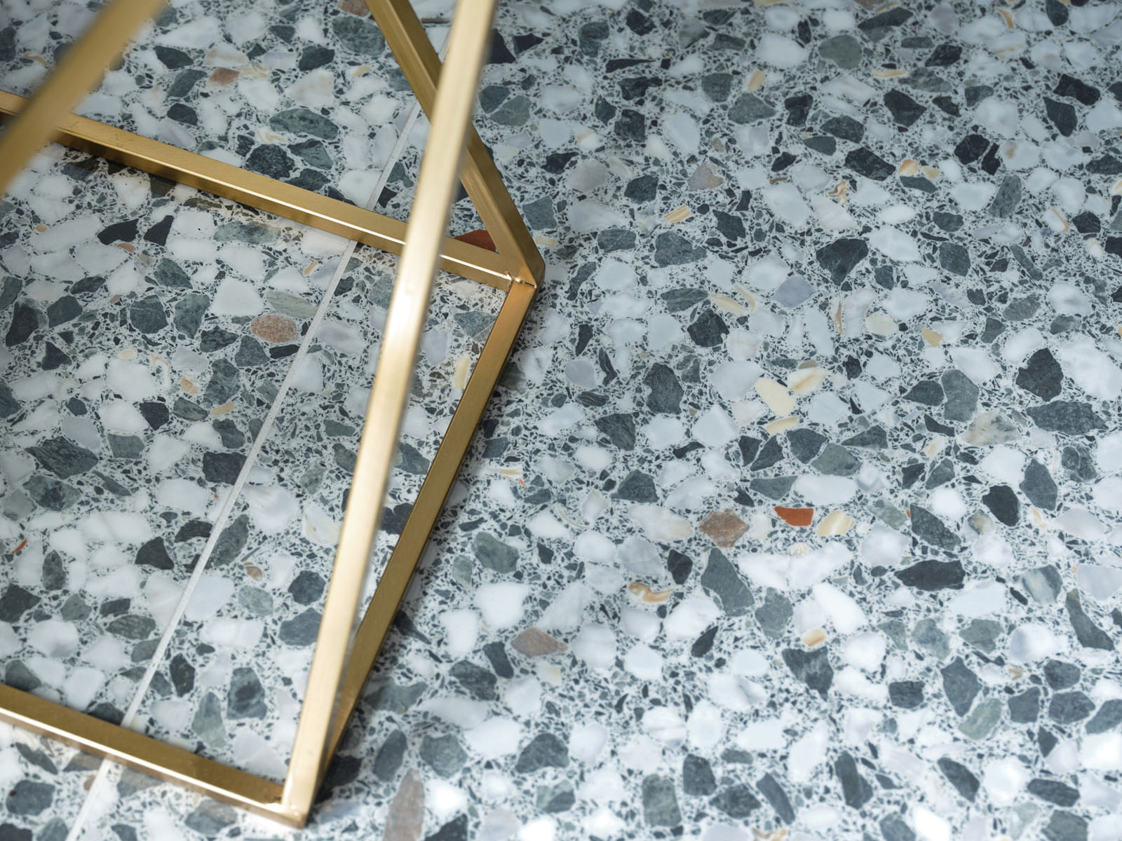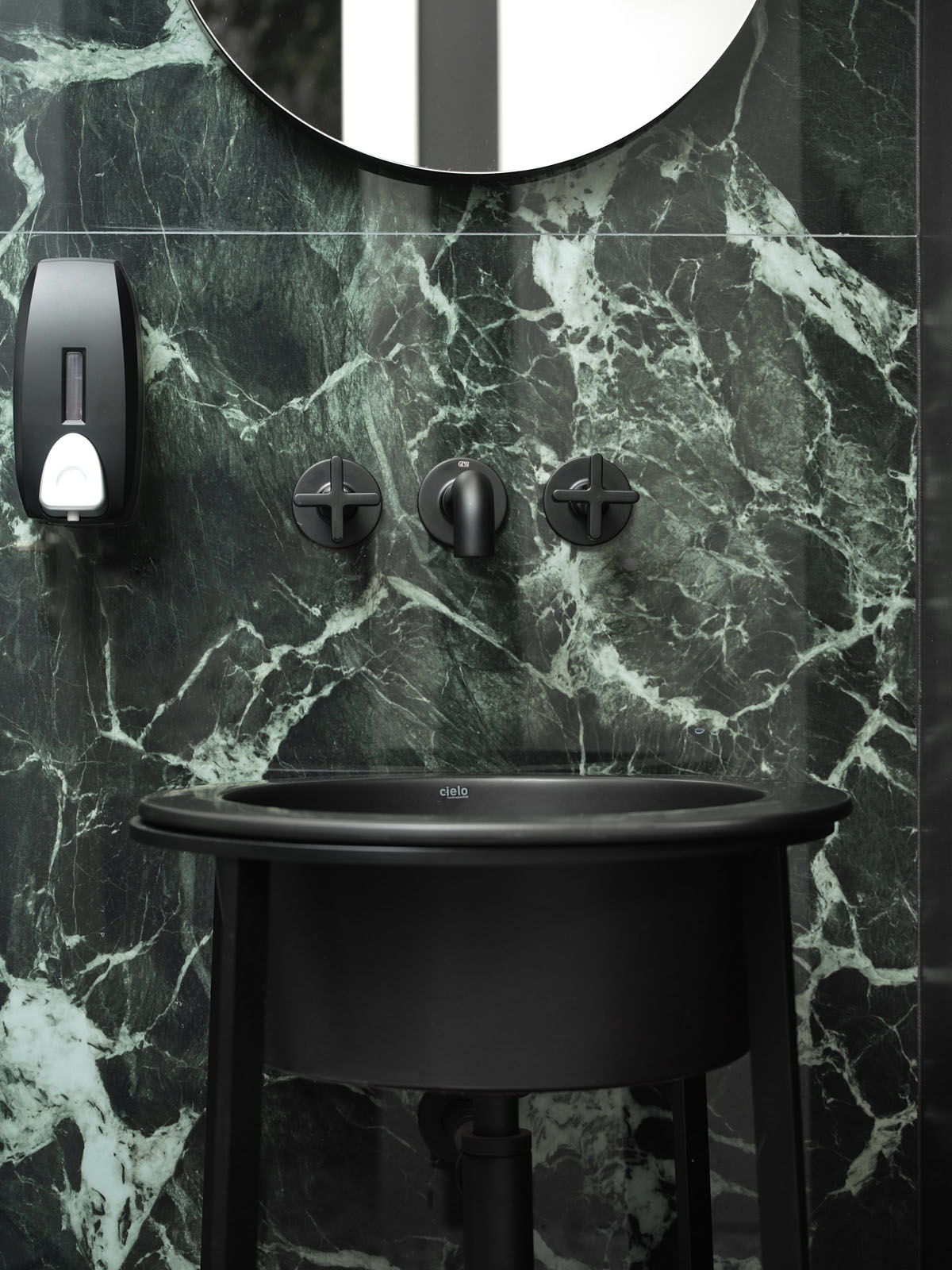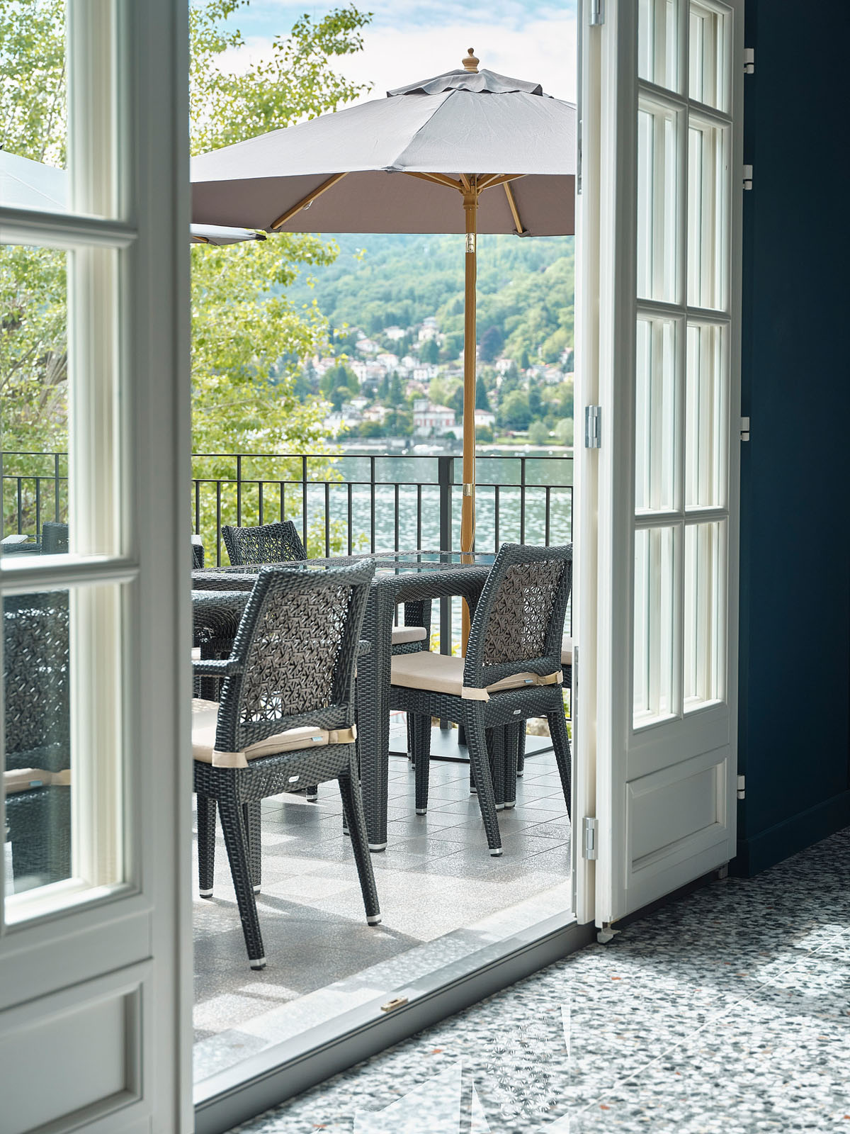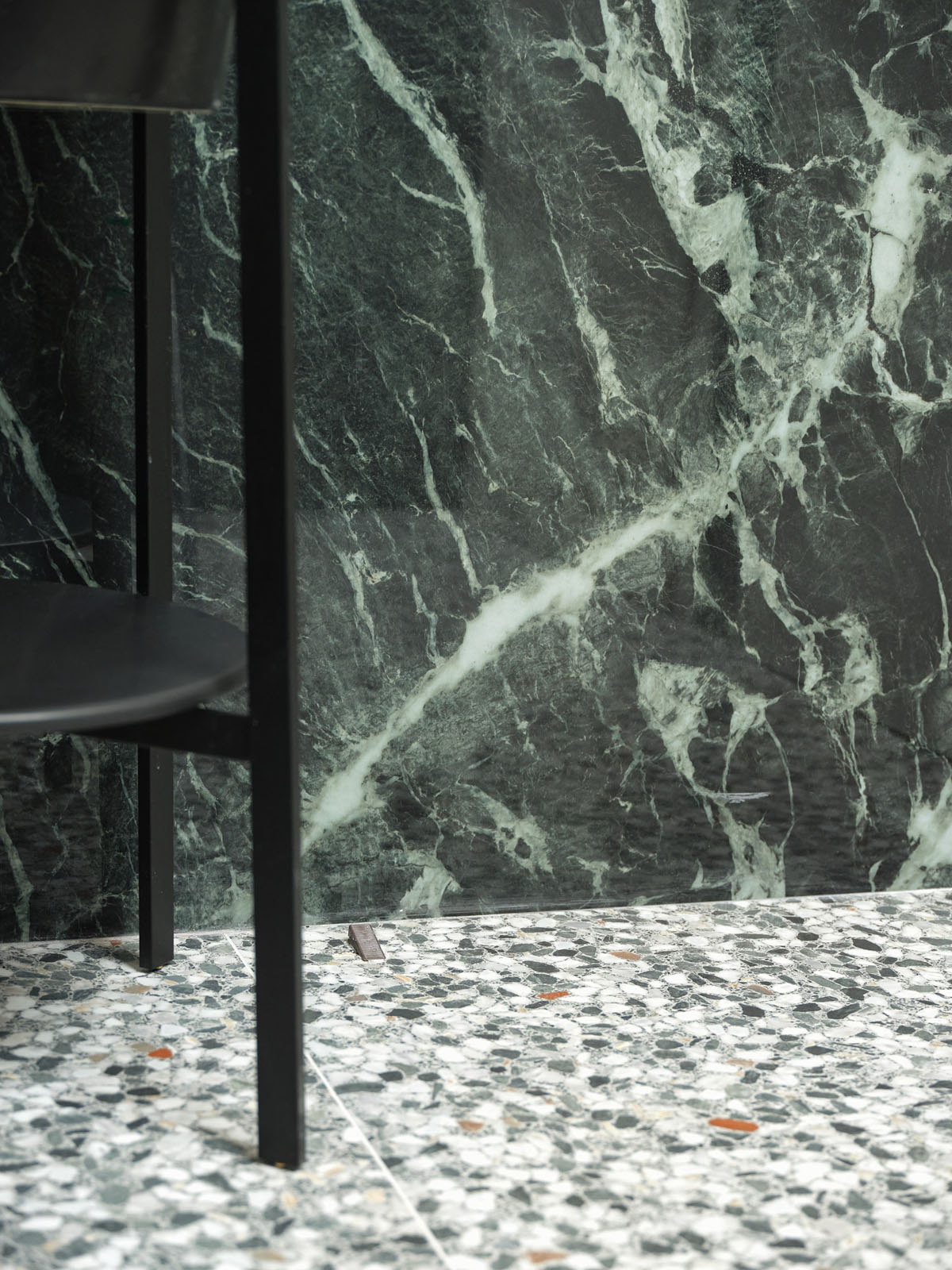The use of Grande Marble Look Ghiara Minuta Mix stoneware makes the rooms brighter, reflecting, with its glossy finish, the movement of the water and colour of the stones. In the bathrooms, the same floor is combined with Grande Marble Look marble-effect slabs (120x240 cm) selected in the deep Verde Aver shade. For the terraces, the choice fell on the Grey and Anthracite tones of grit-effect Crogiolo D_Segni Scaglie stoneware cement tiles laid in a chequered pattern.