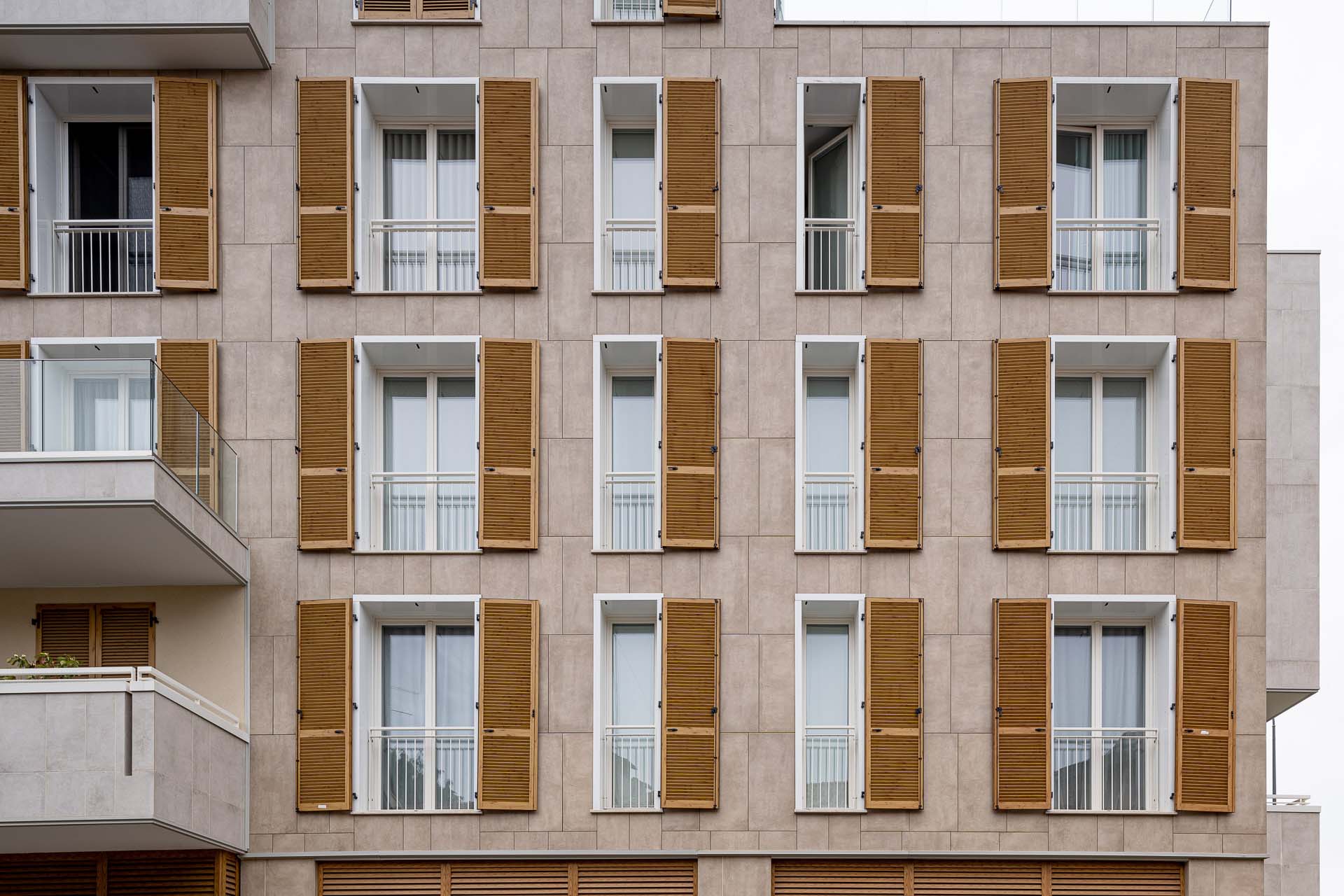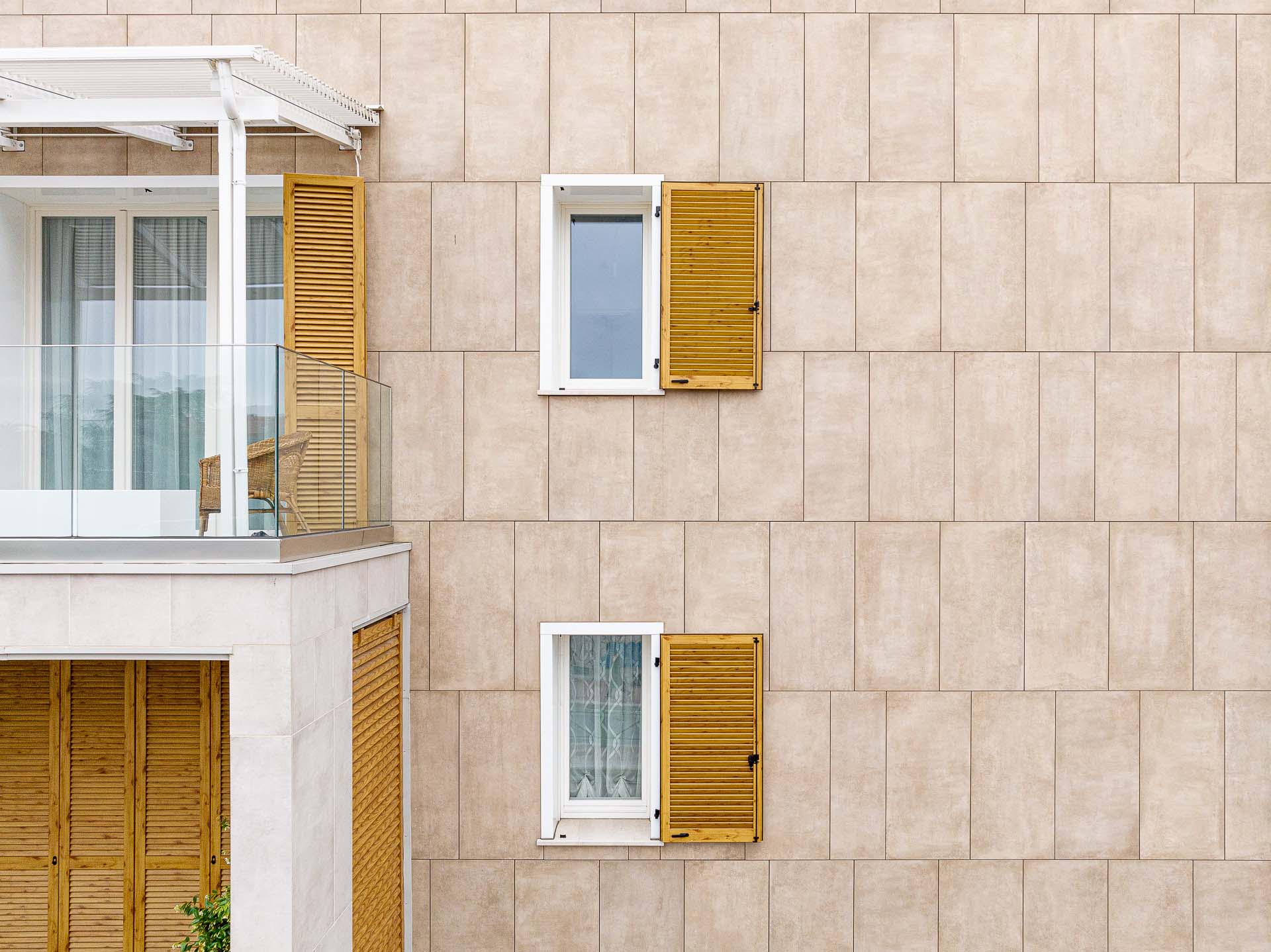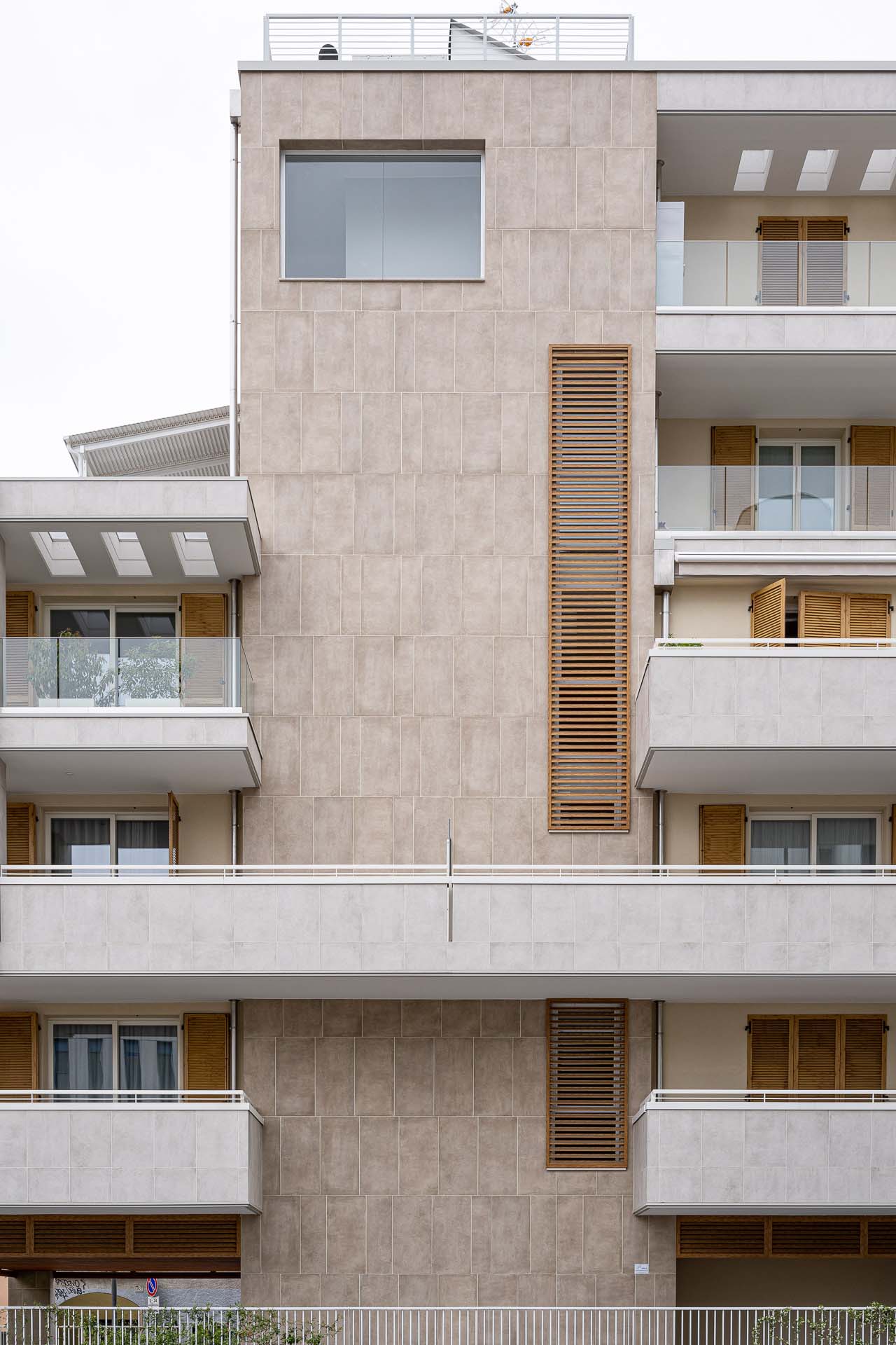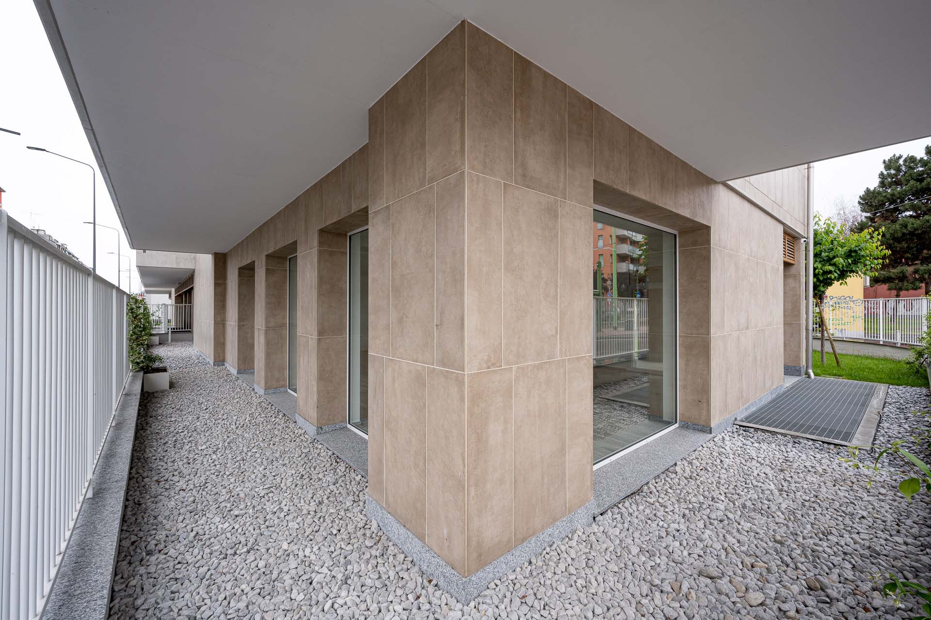 The façades are characterised by the alternation of solid and projecting parts: volumes emerge from the façade, emphasised by retractable glass parapets, leaving the design of the portal structure, which encloses the terrace, unobstructed. “The overhangs are the defining element of the project, which in itself is simple in terms of layout. Fixed sun screens, placed on certain portions of the terraces, enhance the design of the façades not only aesthetically, but also functionally.” For the cladding of the porcelain stoneware façades – the Clays series in the Sand and Cotton colours in the 60x120 cm size – two fixing techniques were adopted: in some portions of the balconies, the tiles were glued; at the ventilated walls, they were mechanically fixed to load-bearing structures. Specifically, the AGS concealed anchoring system was used, which allows the load-bearing substructure to be attached using clamps and the tile to be fixed to the rear surface with special plugs. “The glued parts,” Dominoni specifies, “correspond to the more service-related areas such as stairwells or those parts that do not require insulation. On the façade, we started with a 60x120 cm size, from which sub-measures were cut to create a staggered design that aesthetically animates the solid parts of the walls. The submultiples also allowed us to minimise waste from tile cutting.”