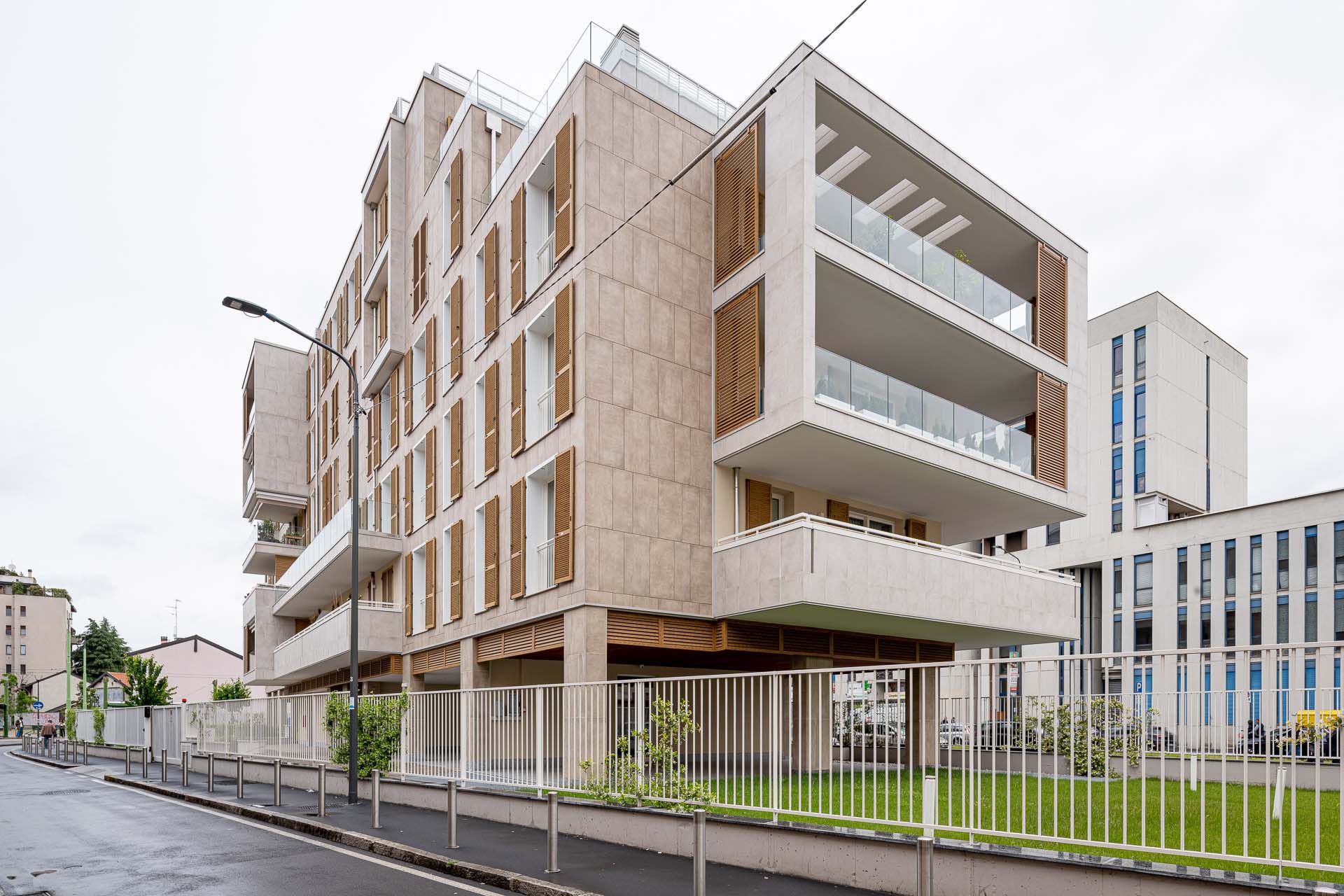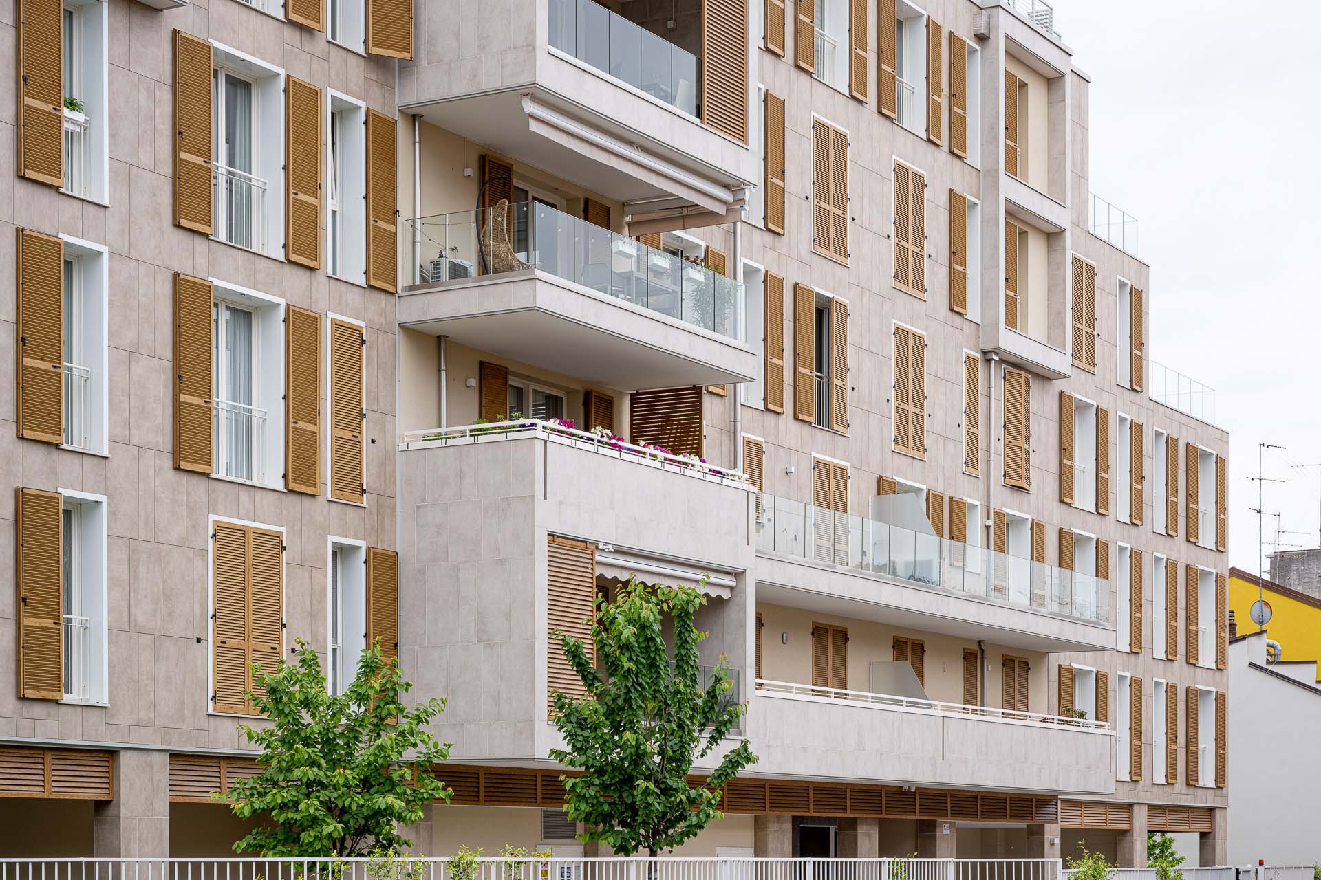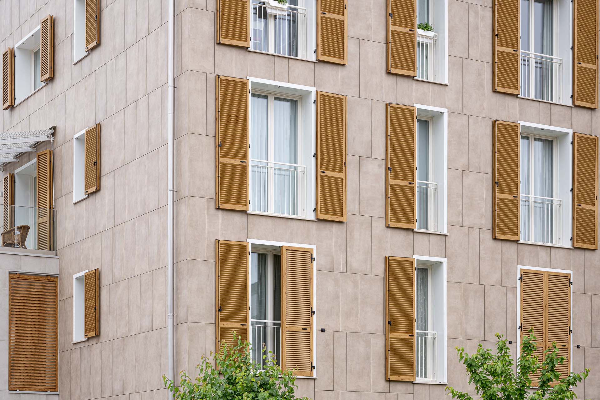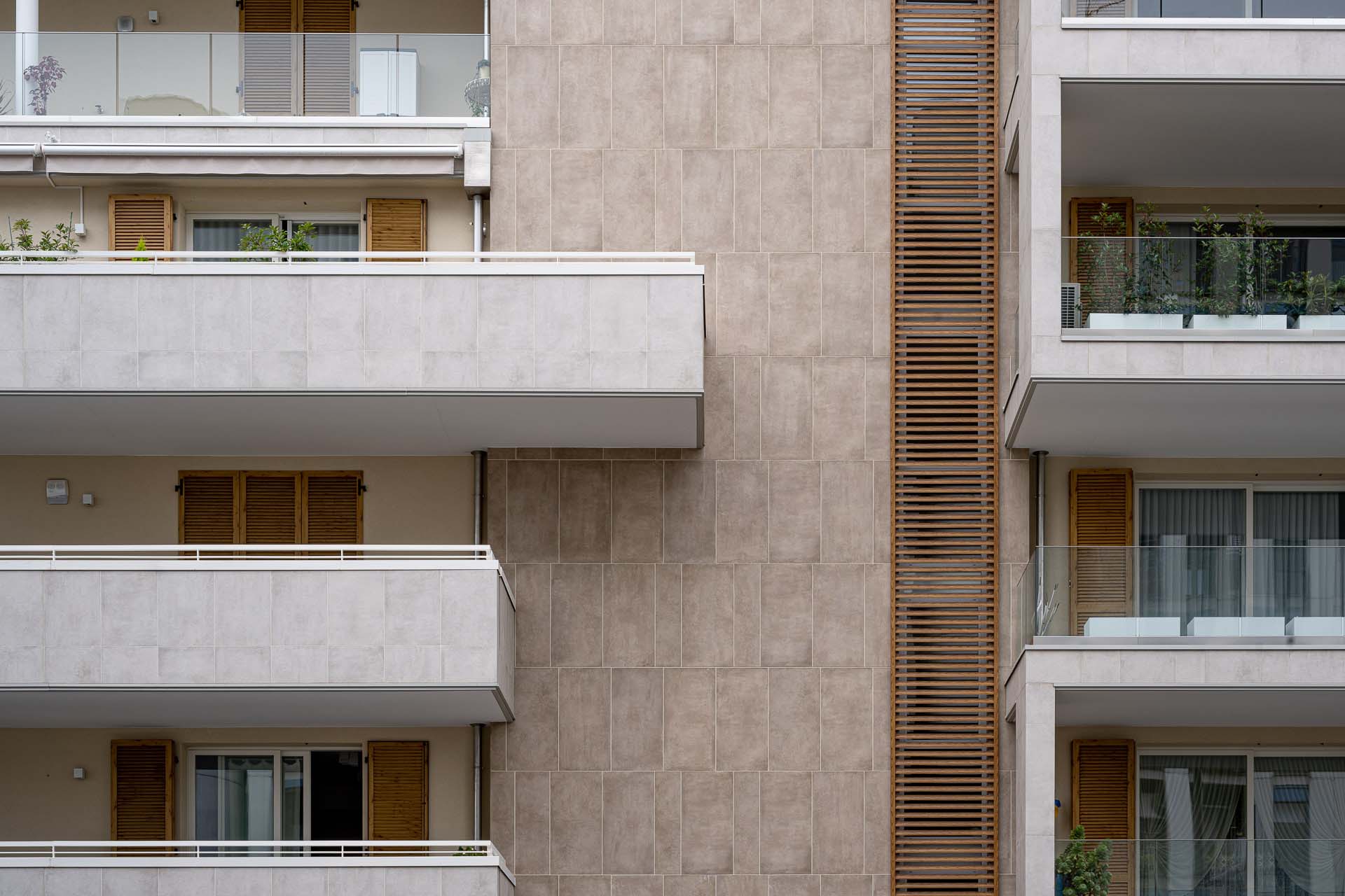 The façades are characterised by the alternation of solid and projecting parts: volumes emerge from the façade, emphasised by retractable glass parapets, leaving the design of the portal structure, which encloses the terrace, unobstructed. “The overhangs are the defining element of the project, which in itself is simple in terms of layout. Fixed sun screens, placed on certain portions of the terraces, enhance the design of the façades not only aesthetically, but also functionally.” For the cladding of the porcelain stoneware façades – the Clays series in the Sand and Cotton colours in the 60x120 cm size – two fixing techniques were adopted: in some portions of the balconies, the tiles were glued; at the ventilated walls, they were mechanically fixed to load-bearing structures. Specifically, the AGS concealed anchoring system was used, which allows the load-bearing substructure to be attached using clamps and the tile to be fixed to the rear surface with special plugs. “The glued parts,” Dominoni specifies, “correspond to the more service-related areas such as stairwells or those parts that do not require insulation. On the façade, we started with a 60x120 cm size, from which sub-measures were cut to create a staggered design that aesthetically animates the solid parts of the walls. The submultiples also allowed us to minimise waste from tile cutting.”