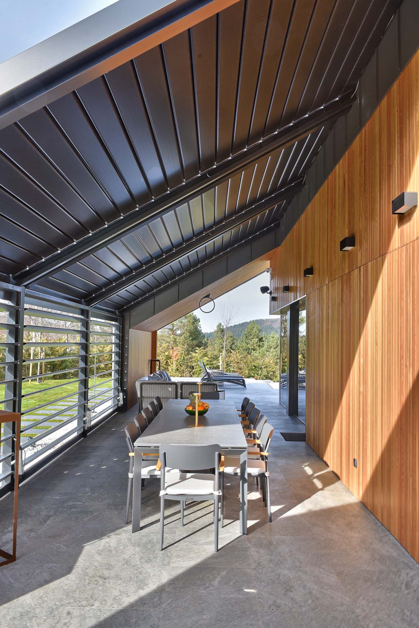 The surfaces of the living room and kitchen, flooded with natural daylight through the large windows with their mountain views, are finished with all the beauty of sedimentary rocks thanks to the Mystone Ardesia collection, installed here in Cenere colour (75x150 cm), which gives way in the large roofed patio to Mystone Quarzite in Platinum colour in the 60x120 cm size.