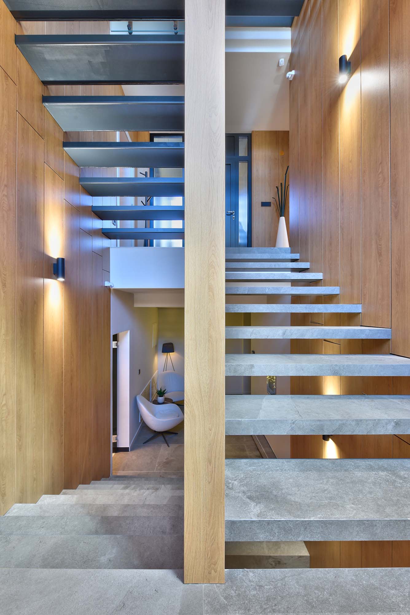 “To maintain this home’s strong links to the surrounding landscape, we worked very hard on the choice of materials,” the firm’s founders explain. “The laminated wood that predominates as construction material and as cladding for the main body of the house dialogues with the large surfaces covered with porcelain stoneware, which is well attuned to our vision and is also low-impact. Its sustainability lies not just in the form of the material itself but also in the processes used to manufacture it.”