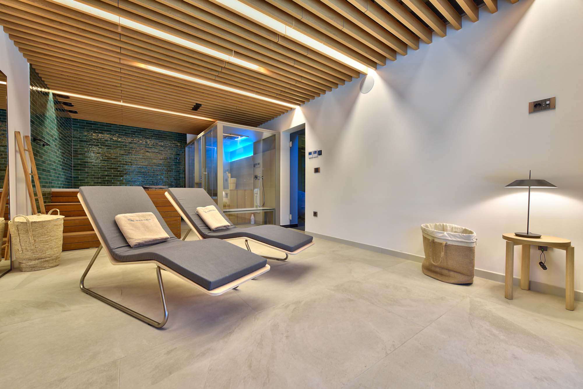 The rough surfaces of the surrounding mountains are also referenced in the bathrooms, where the Mystone Limestone collection, in Sand colour, covers the bathtub wall and the floor of the shower, while the stone effect of Mystone Ardesia in Bianco Colour – in 75x150 cm size – completes the flooring of the wellness area.