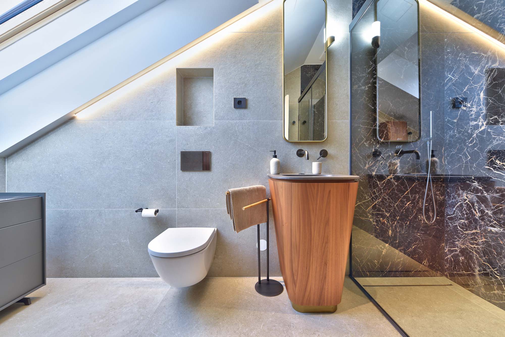 The only digression from the Stone and Marble Look ranges is provided by the lovely walls in the Green colour from the Crogiolo Lume series: its glossy, “flawed” brick tiles (6x24 cm) generate unique reflections in the space that houses the Jacuzzi tub.